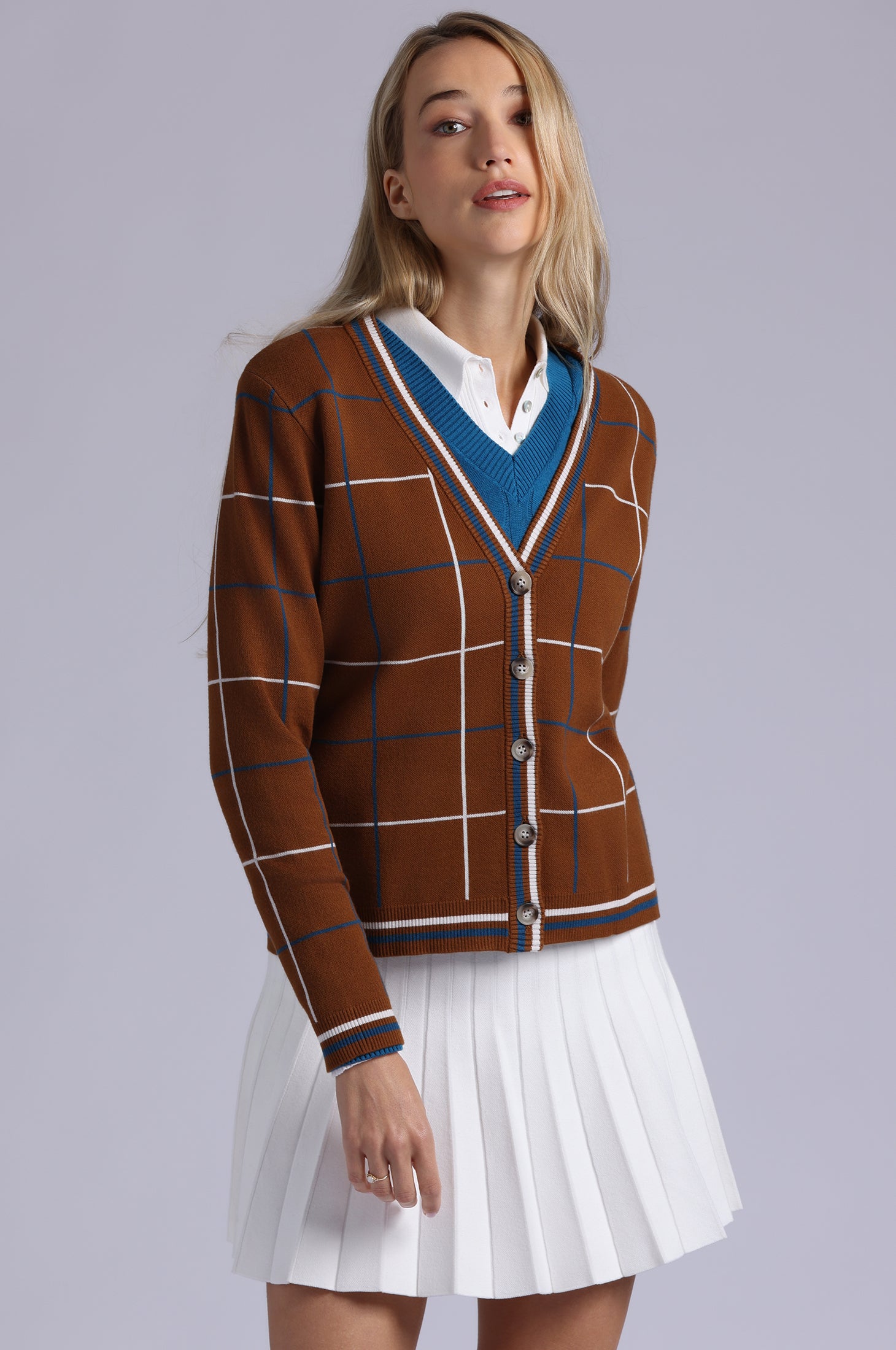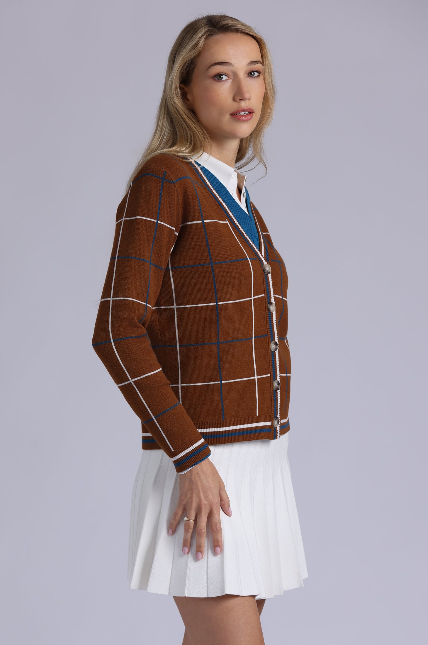 The cardigan that walks into a room before you do. Drapey, soft, plaid perfection with tipping that says ‘don’t even try to compete. Soft, drapey, and effortlessly cool, wear it buttoned for polished charm, layered for street-ready edge, or tossed over everything in your closet