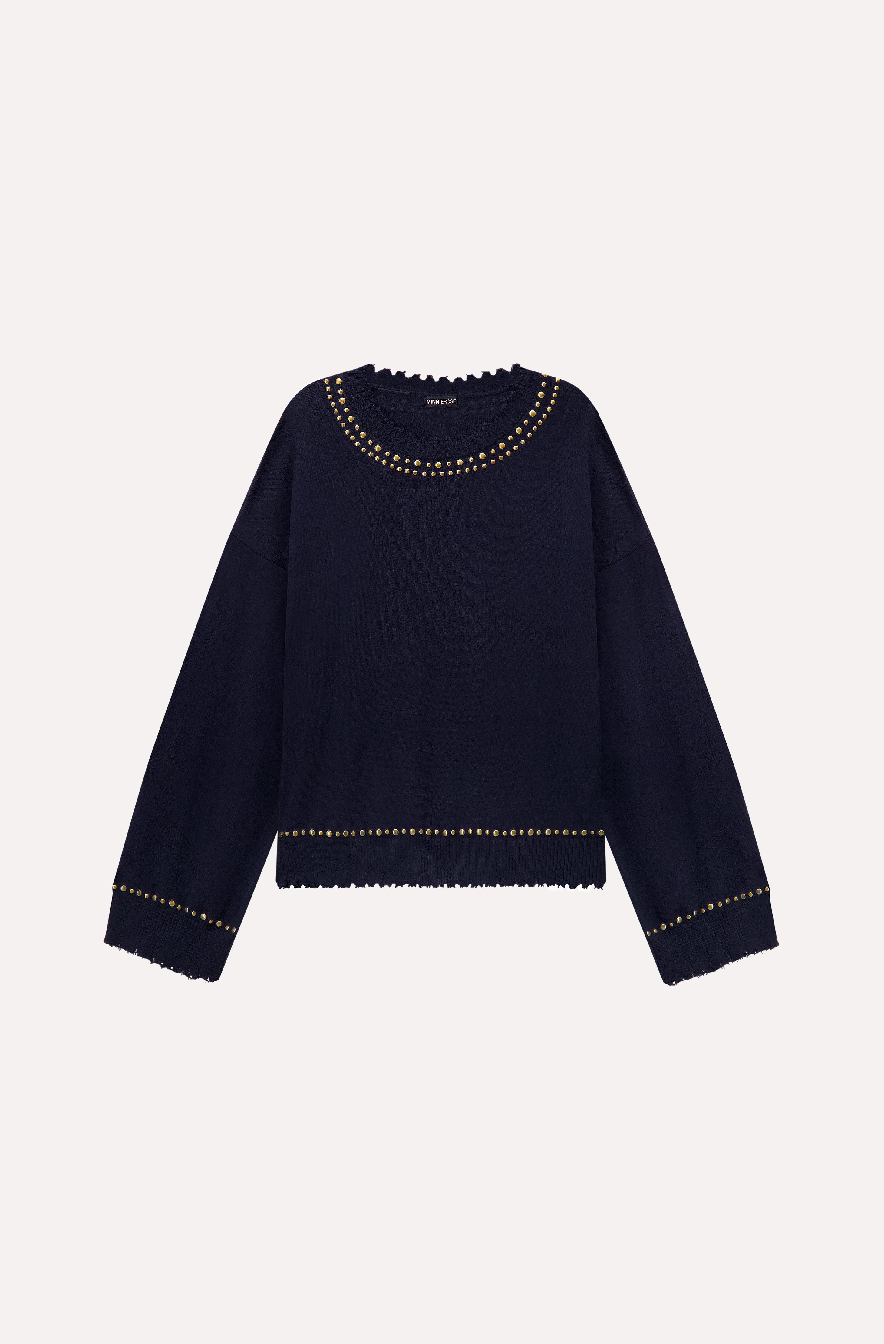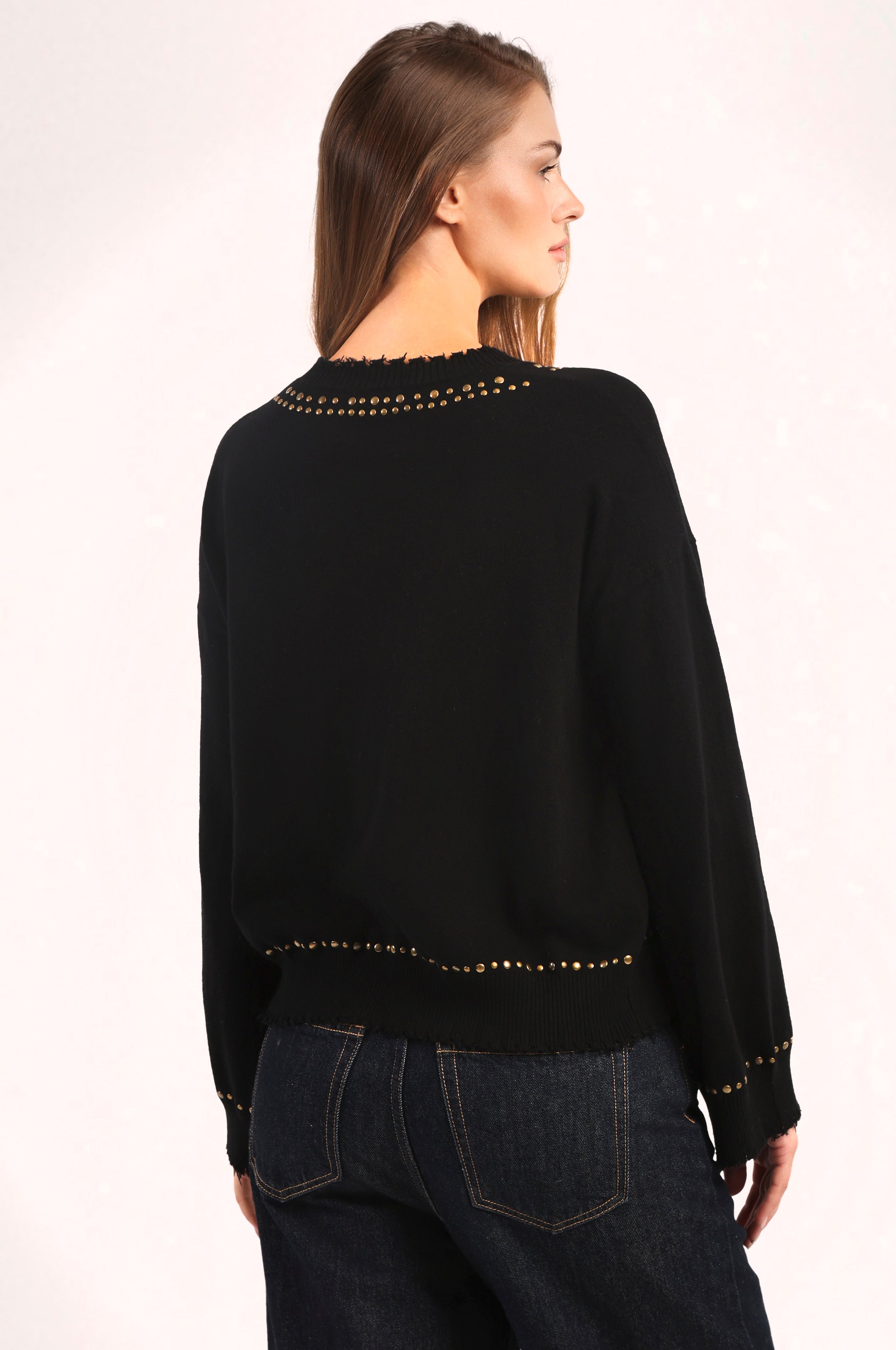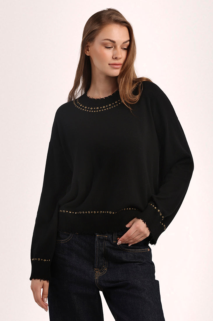 Soft, sleek, and a little rock ’n’ roll. This ultra-comfy cotton cashmere crew turns heads with frayed edges, studded detailing, and flared bell sleeves. The relaxed fit keeps it effortlessly wearable — the perfect mix of cozy comfort and cool-girl edge.