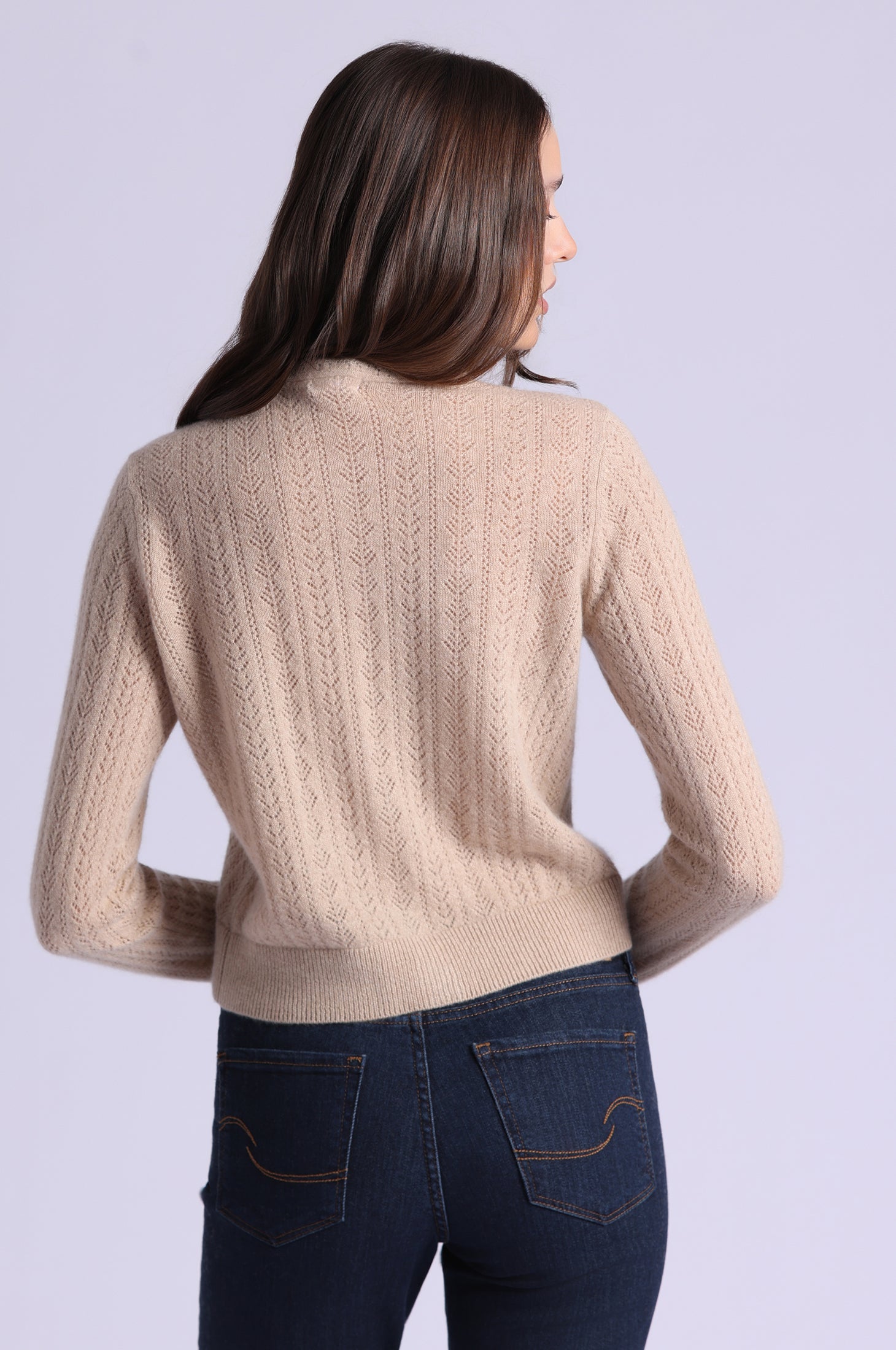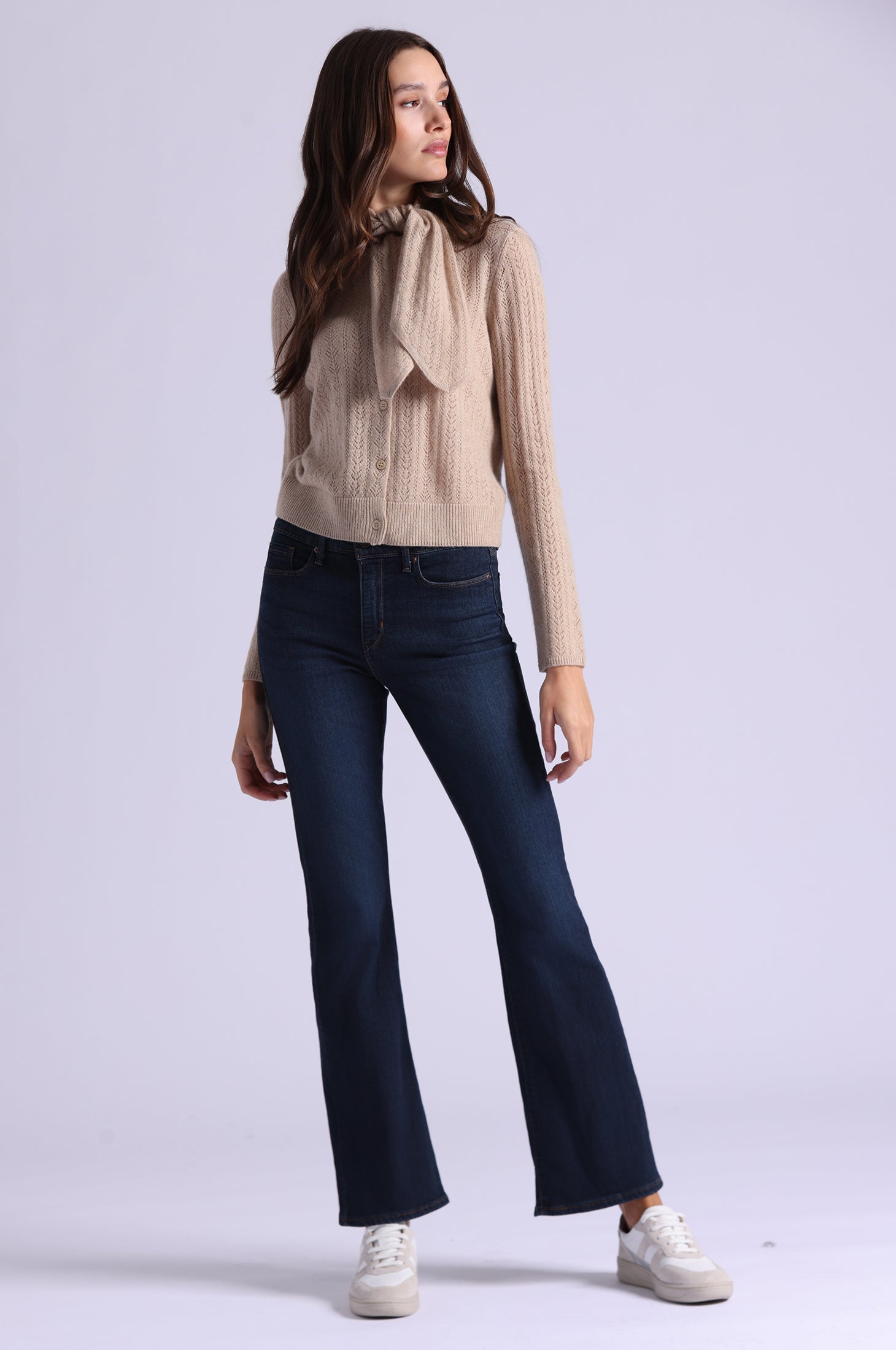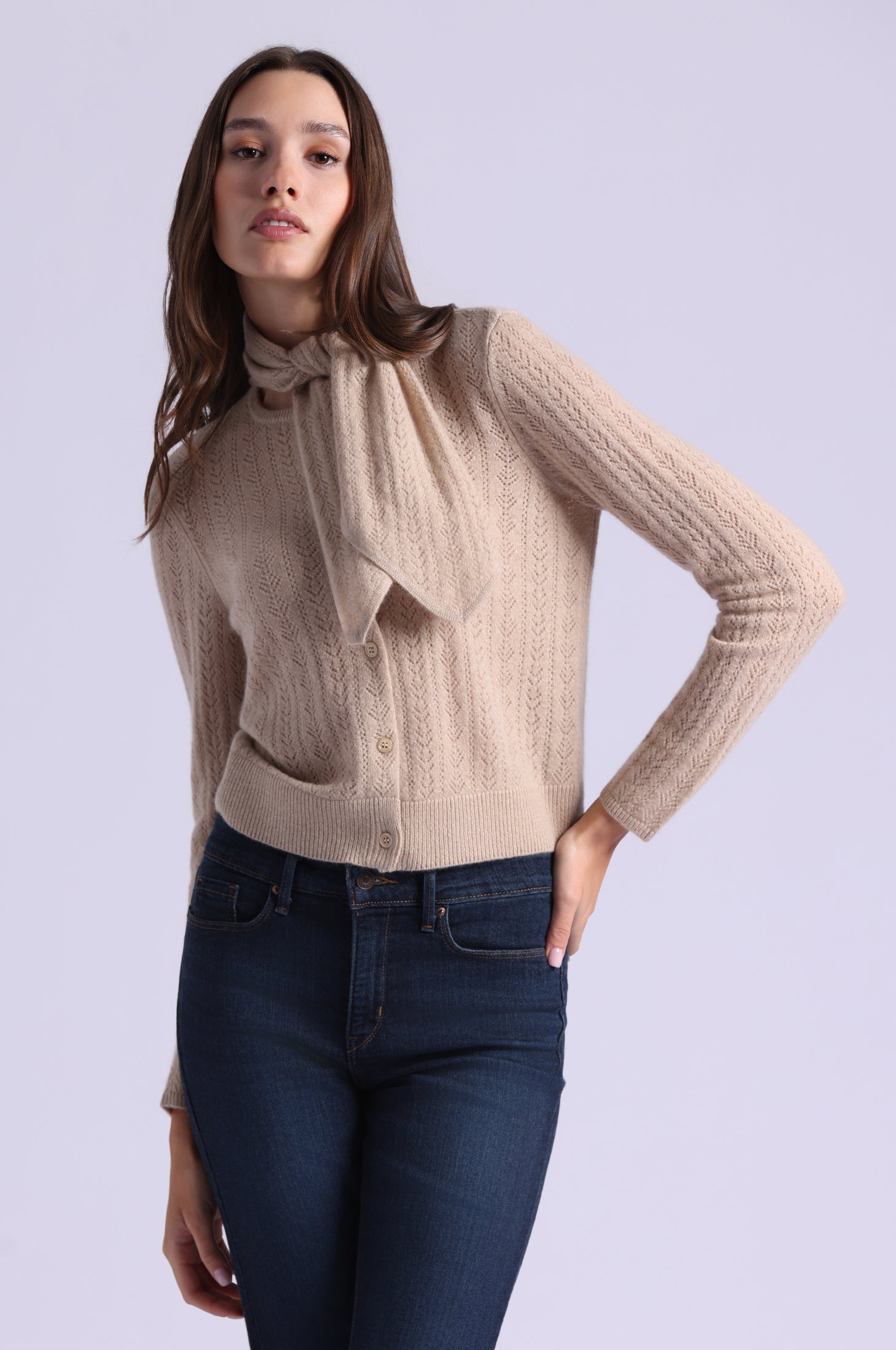 This cardigan pairs soft, lightweight cashmere with intricate pointelle detailing, while the tie-front adds a flattering, modern touch. Effortless to layer or wear alone, it’s the kind of piece that feels chic, cozy, and unmistakably elevated.