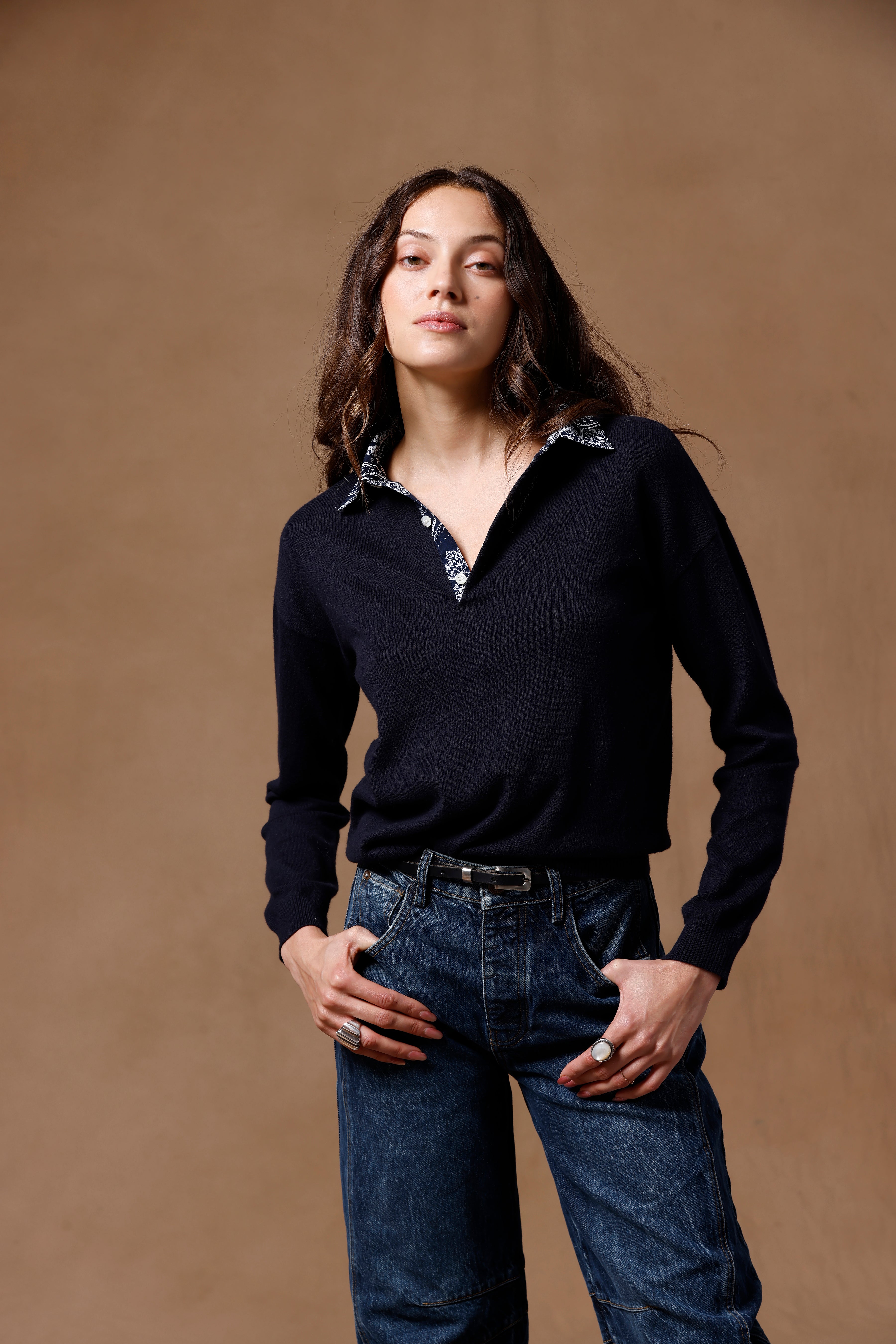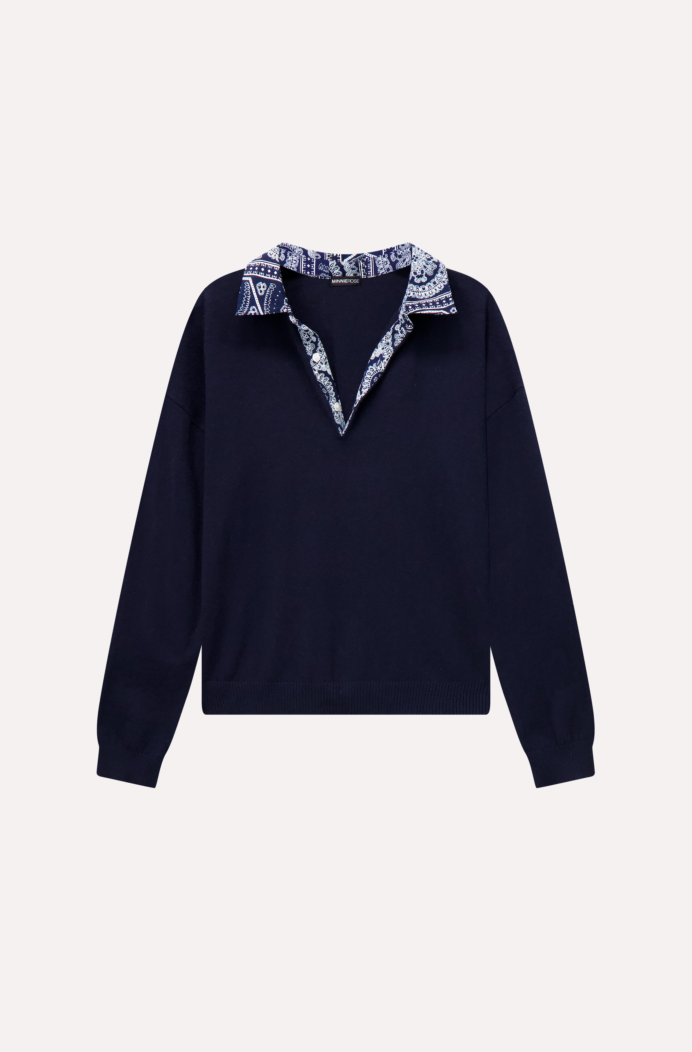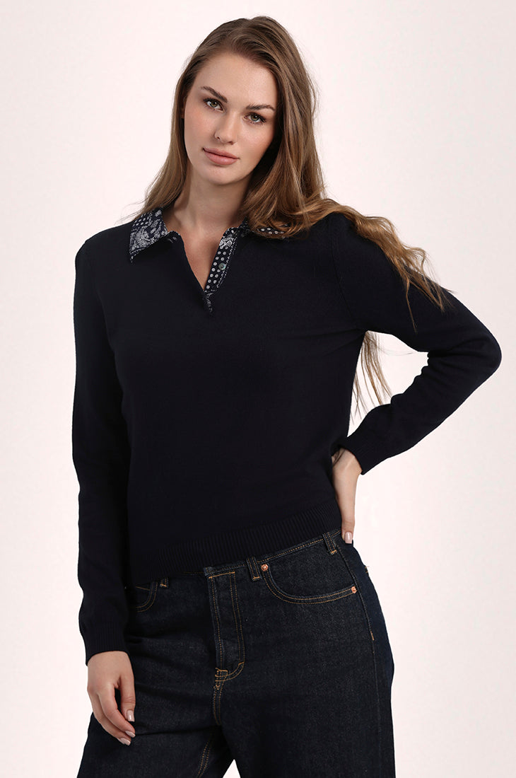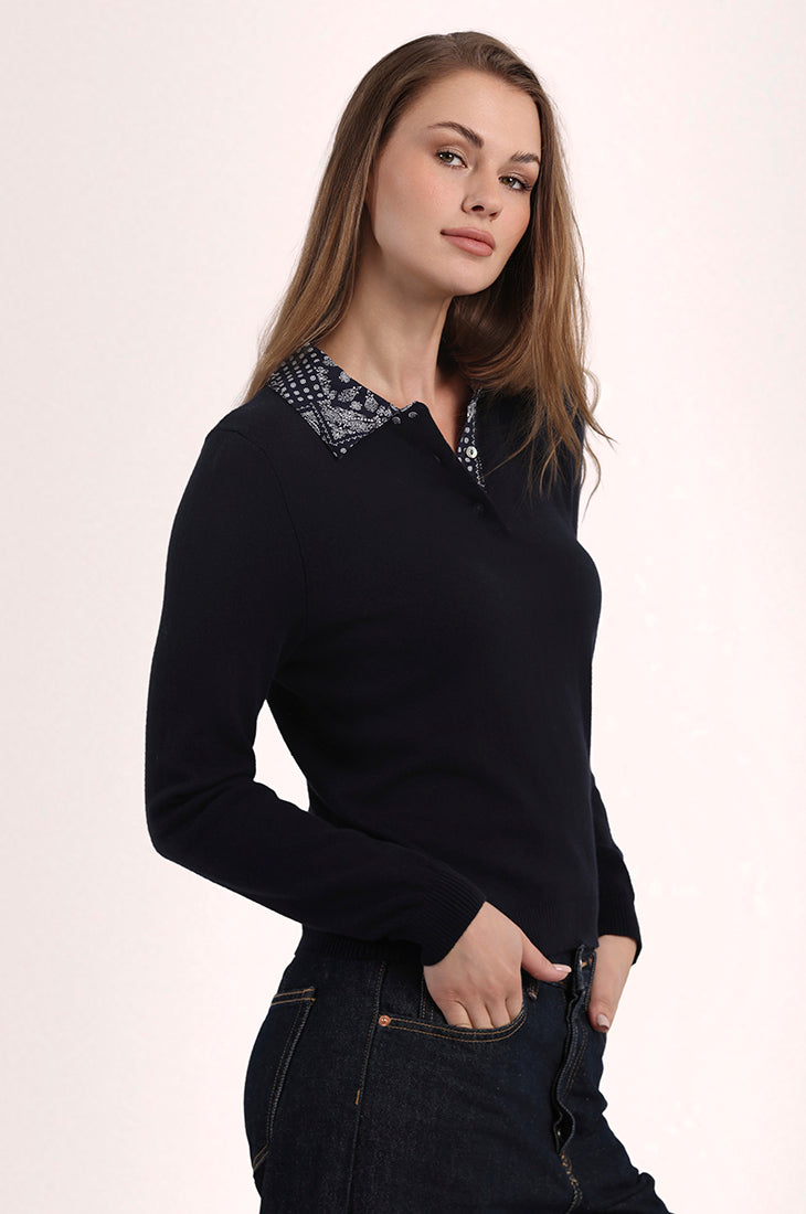 This isn’t your average pullover. The Cotton Cashmere Woven Bandana Collar Pullover brings serious personality with a playful twist—thanks to its unique bandana-style collar and ultra-soft cotton cashmere yarn that feels like a hug (but cuter).