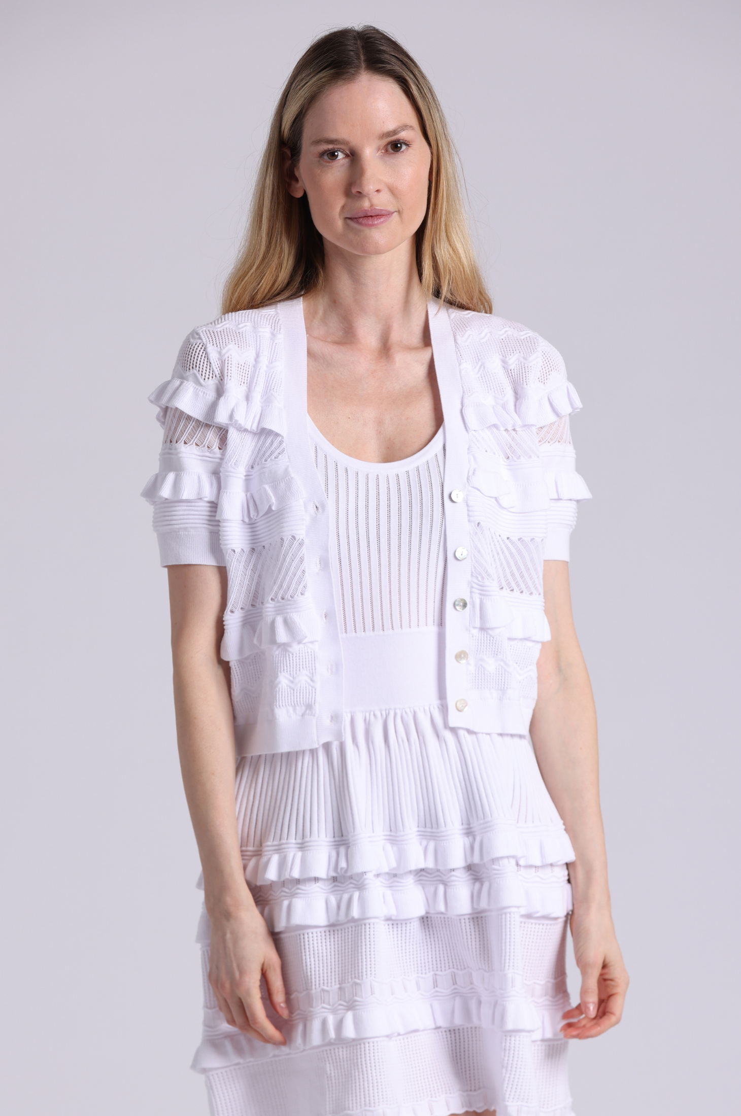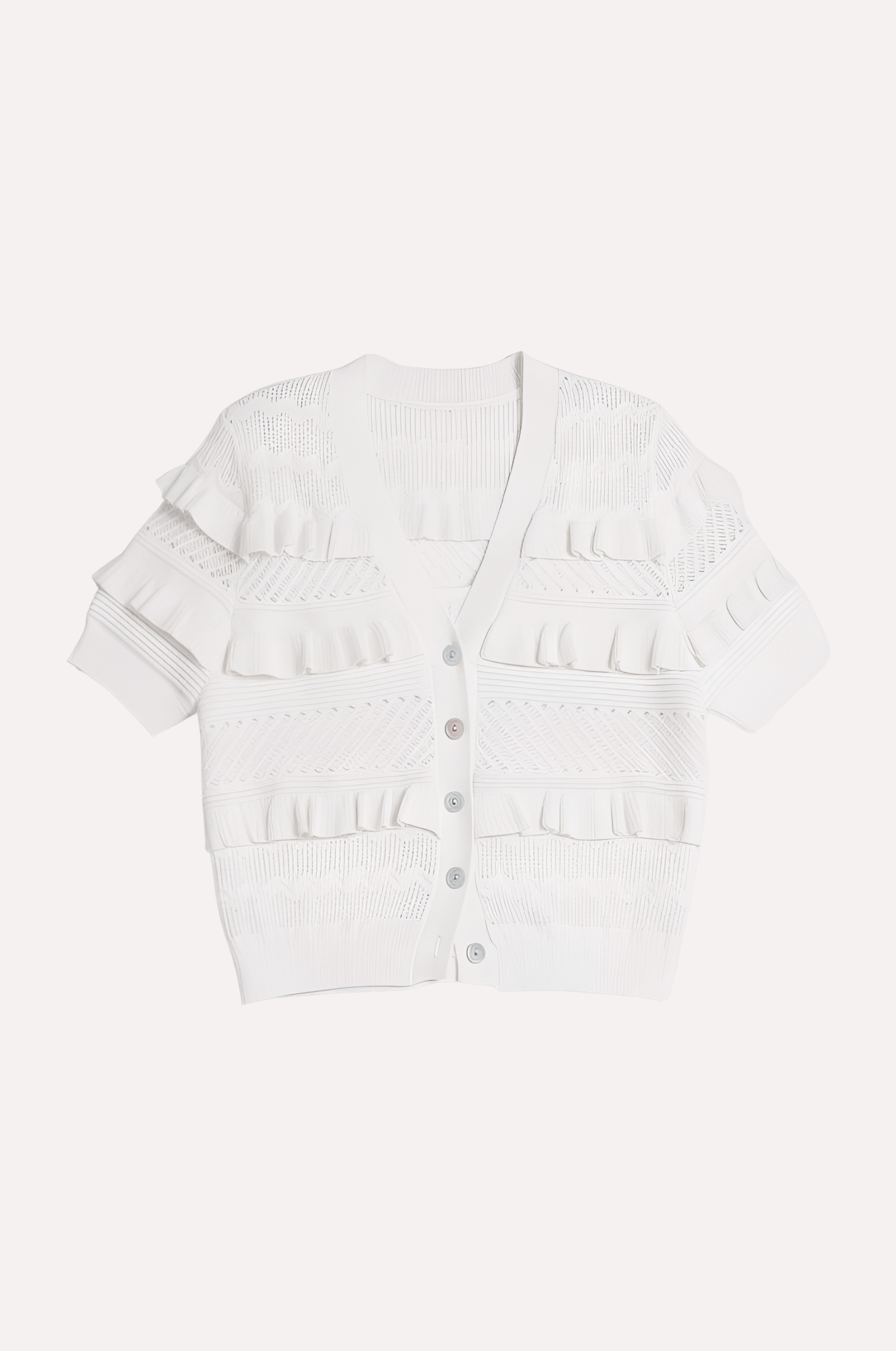 Airy pointelle viscose shaped into a short sleeve silhouette with gentle puff through the body and sleeves. Finished with a 360° ruffle button-down front and fitted sleeve and hem trims for definition.