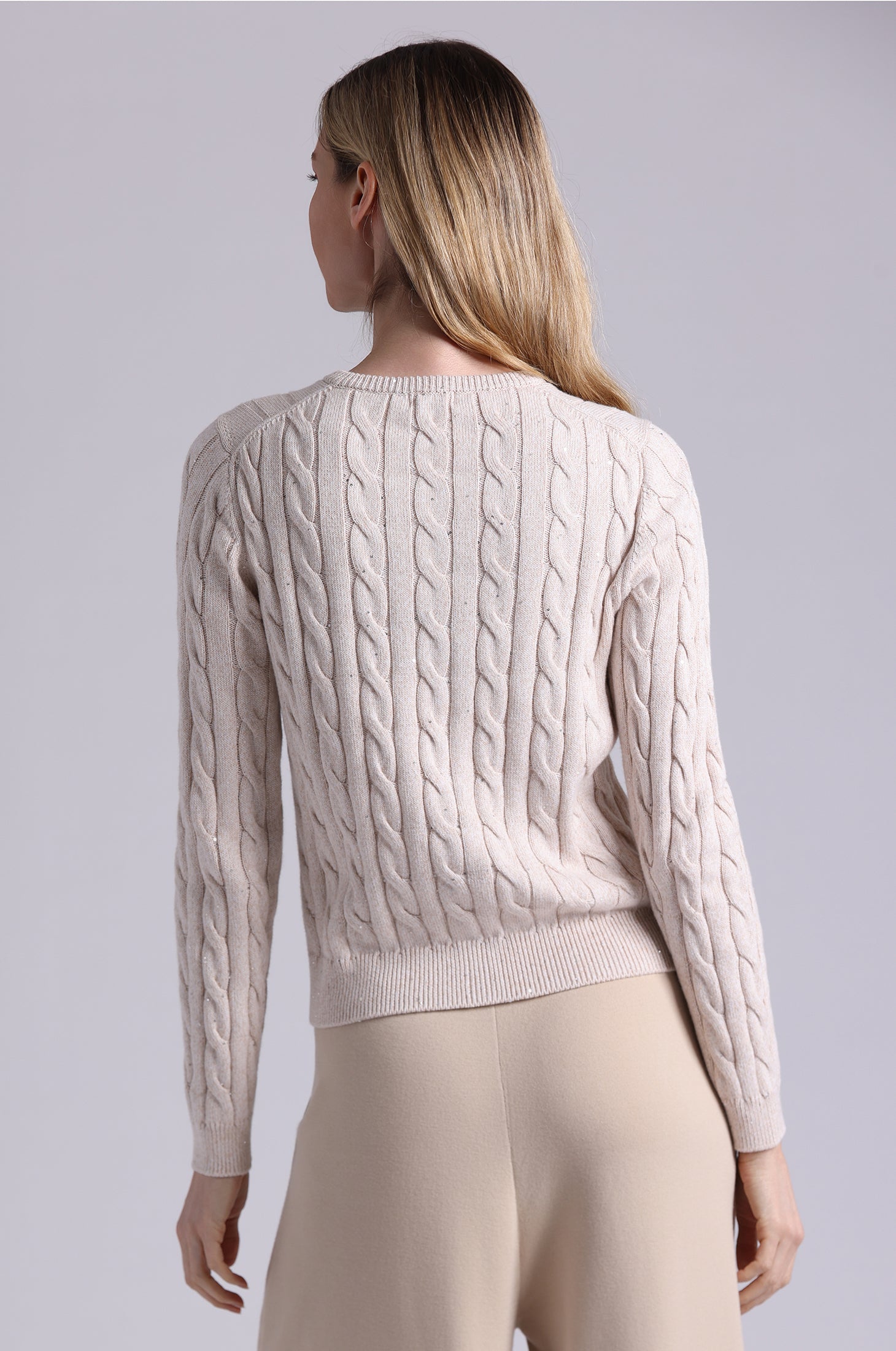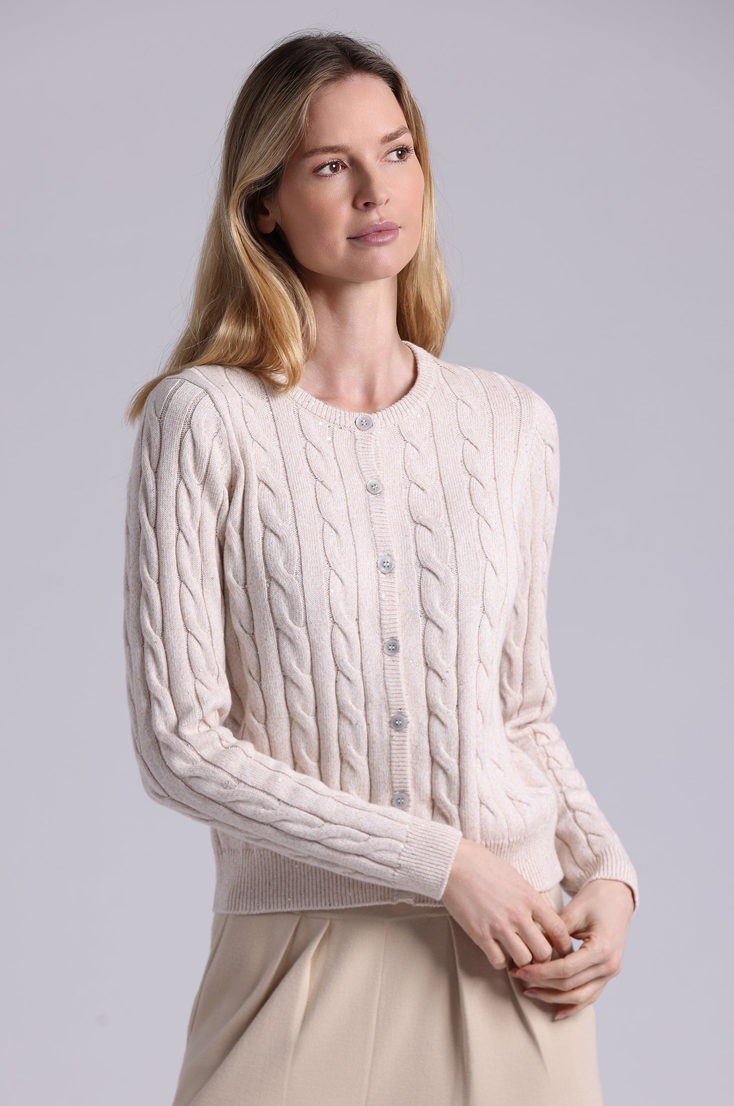 A luxe twist on a classic, this long sleeve cardigan features shimmering cable knit detailing for subtle sparkle and soft, lightweight cotton-blend fabric that drapes beautifully—perfect for layering or wearing on its own.
