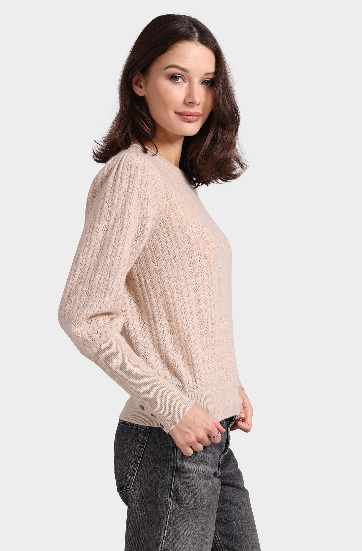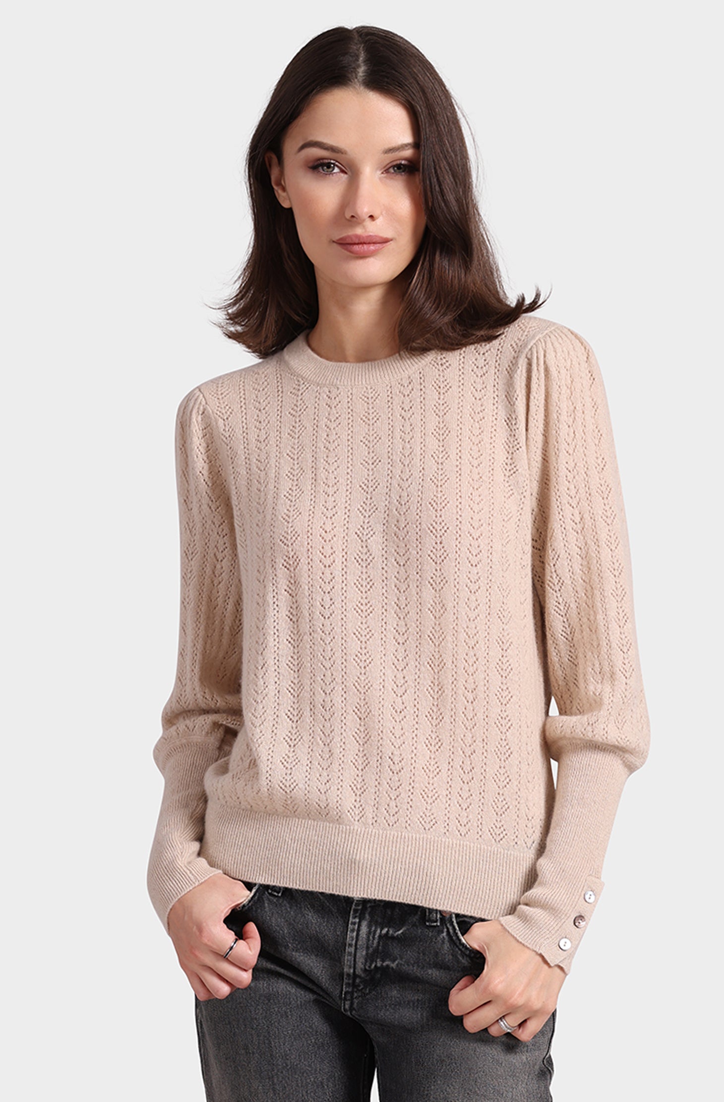 It's the perfect blend of comfy and stylish. Made from super soft cashmere, this pullover is perfect for those chilly days and cozy nights. The blousant sleeves give it a fun, relaxed vibe while the classic crew neck keeps it timeless. It pairs effortlessly with everything from your go-to jeans to tailored pants.