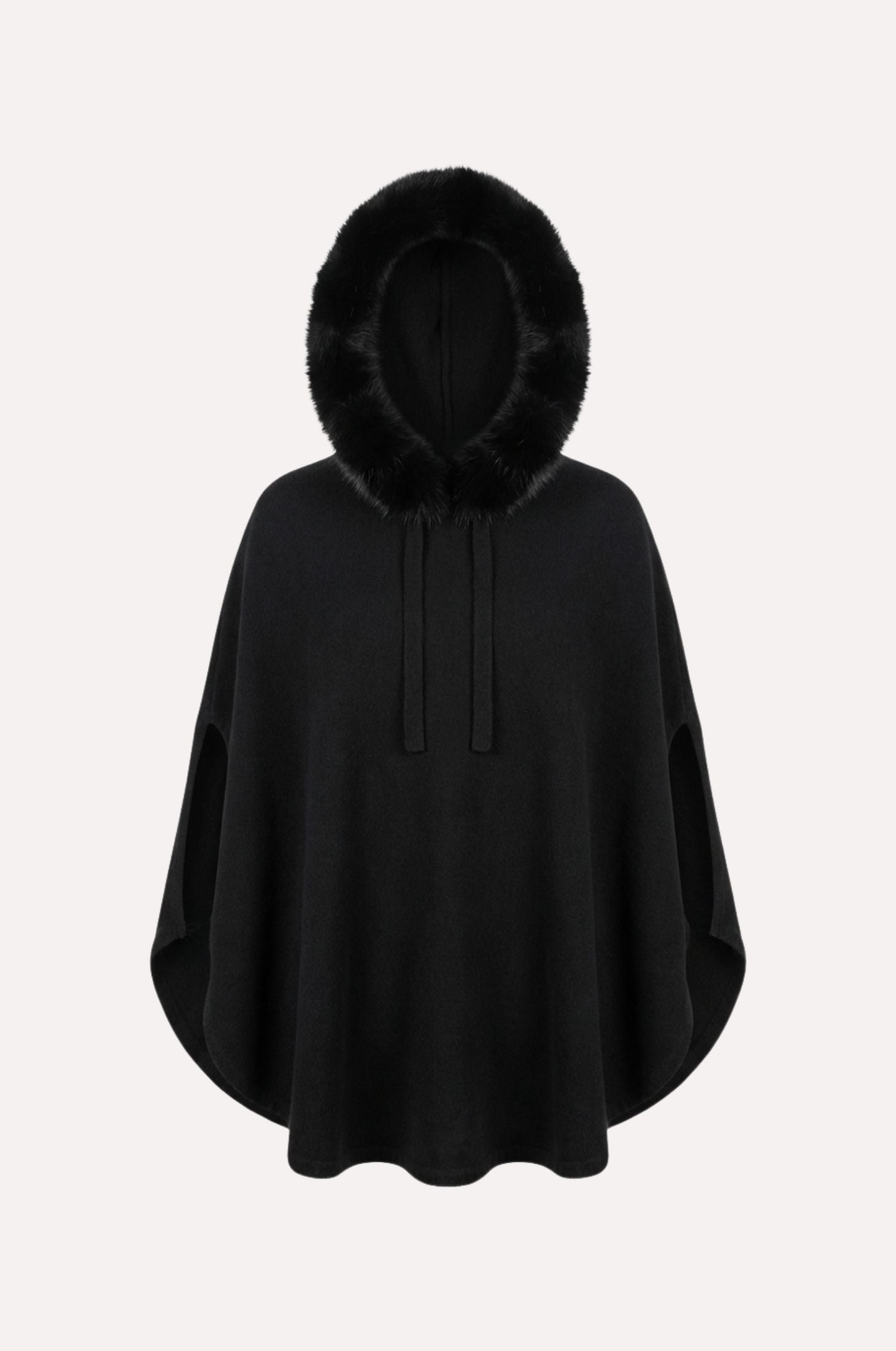 A masterpiece of modern luxury, the Luxe Cashmere Poncho with Fur Hooded Trim wraps you in softness and statement style. Crafted from sumptuous cashmere, its flowing silhouette moves with effortless grace, while the plush fur-trimmed hood adds drama and warmth.