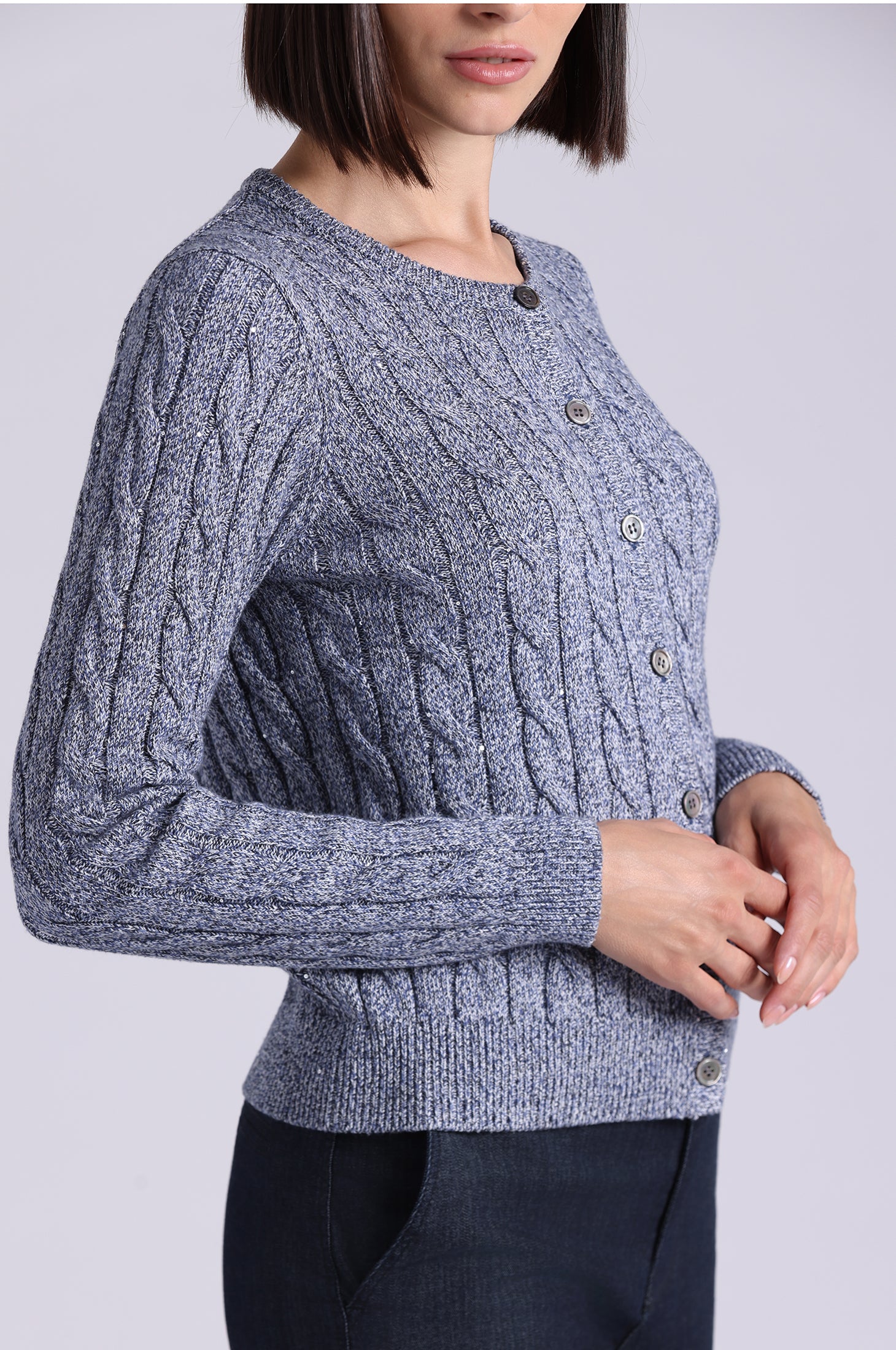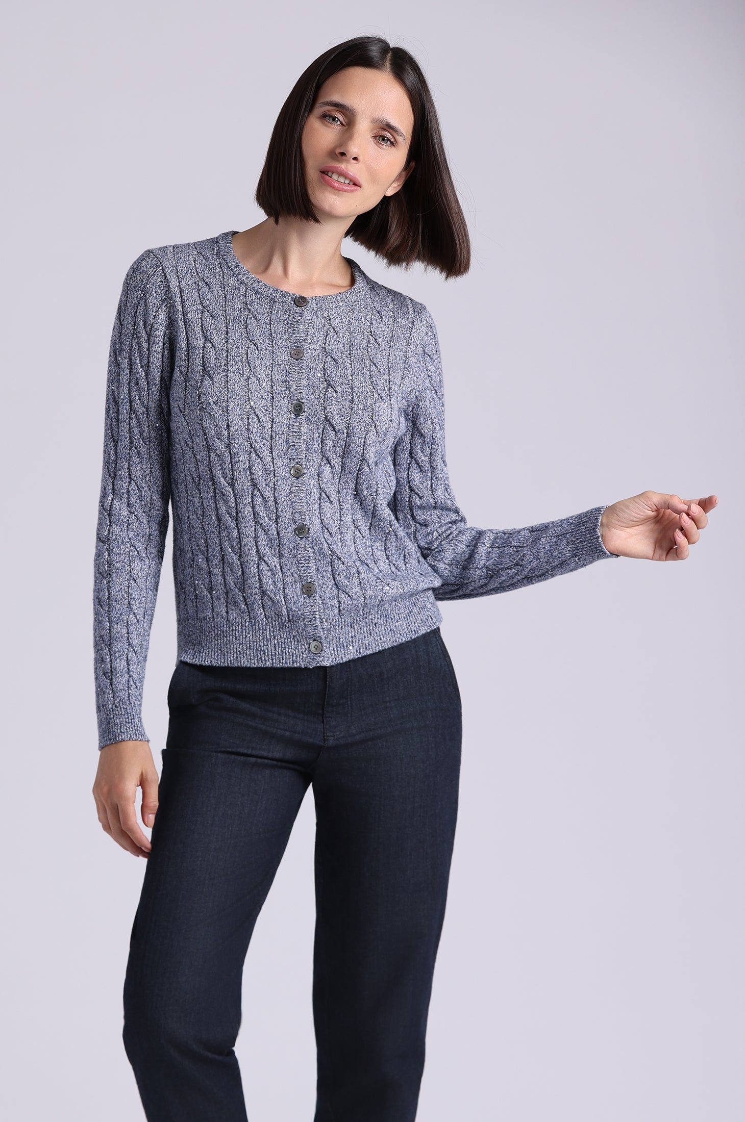 A luxe twist on a classic, this long sleeve cardigan features shimmering cable knit detailing for subtle sparkle and soft, lightweight cotton-blend fabric that drapes beautifully—perfect for layering or wearing on its own.
