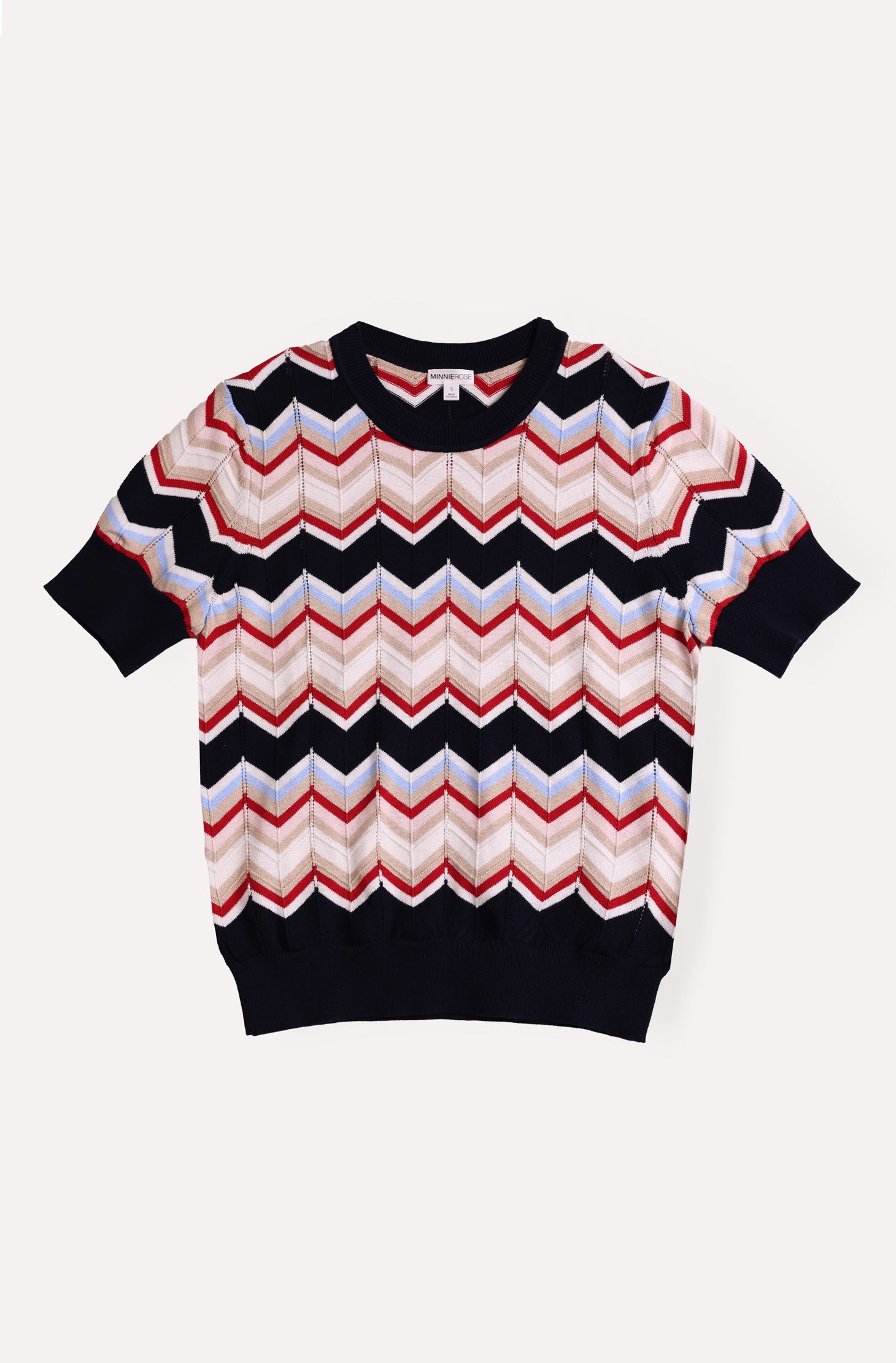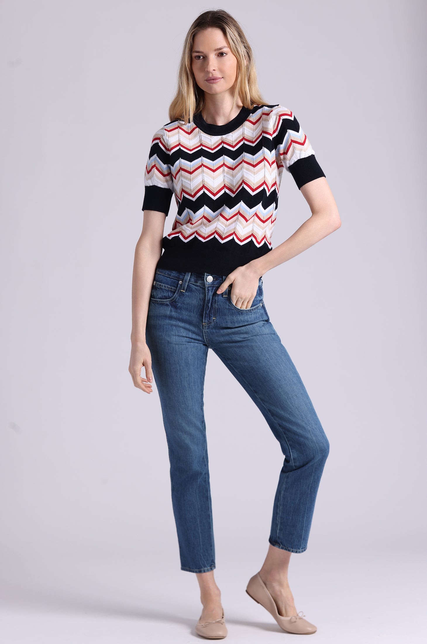This short sleeve crew features textured chevron detailing, a relaxed fit that sits softly off the body, and a fitted hem for subtle shape, crafted from soft, lightweight cotton-cashmere. Part of the Chevron Collection, it pairs seamlessly with the coordinating sleeveless shell and cardigan.