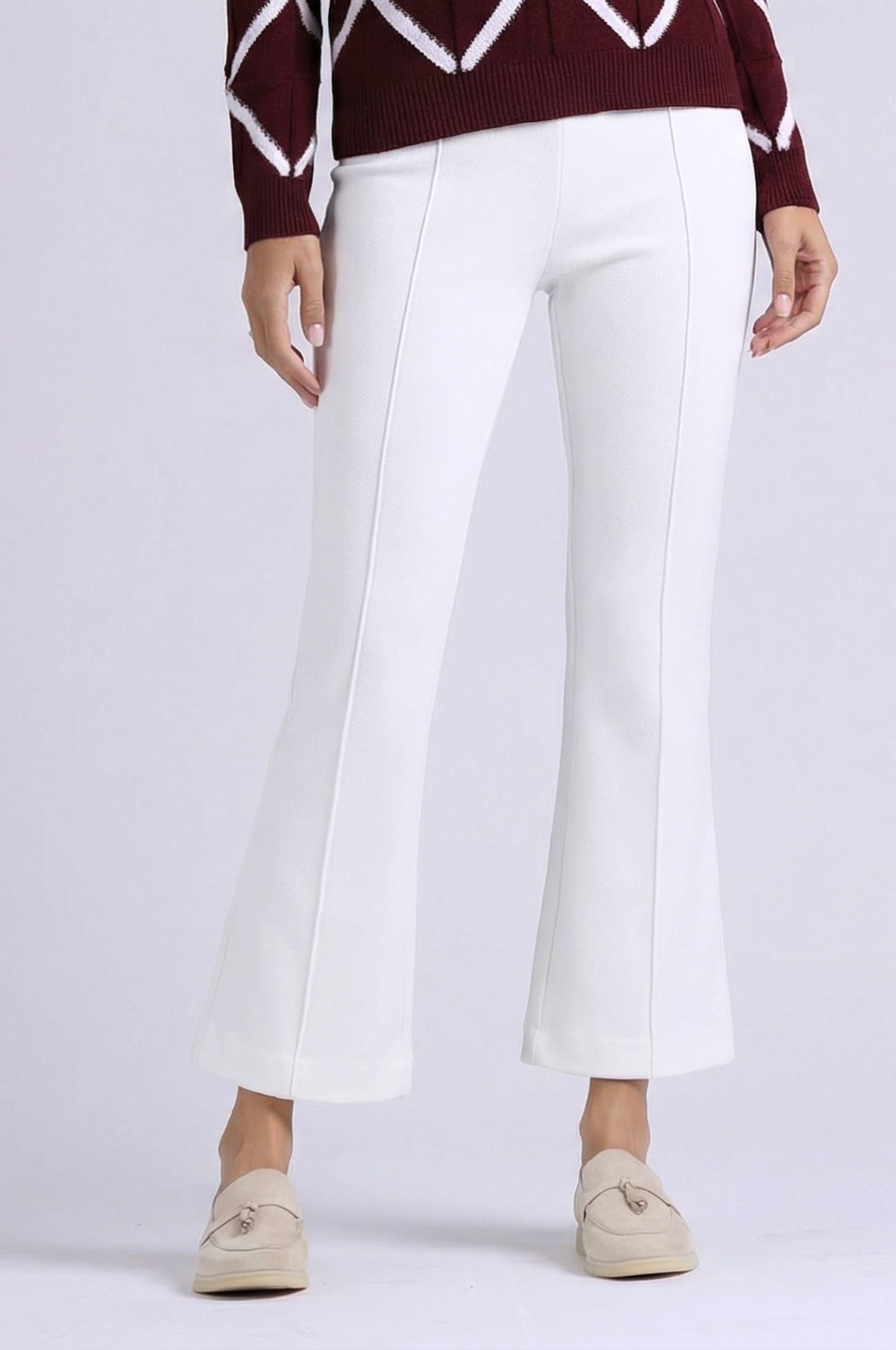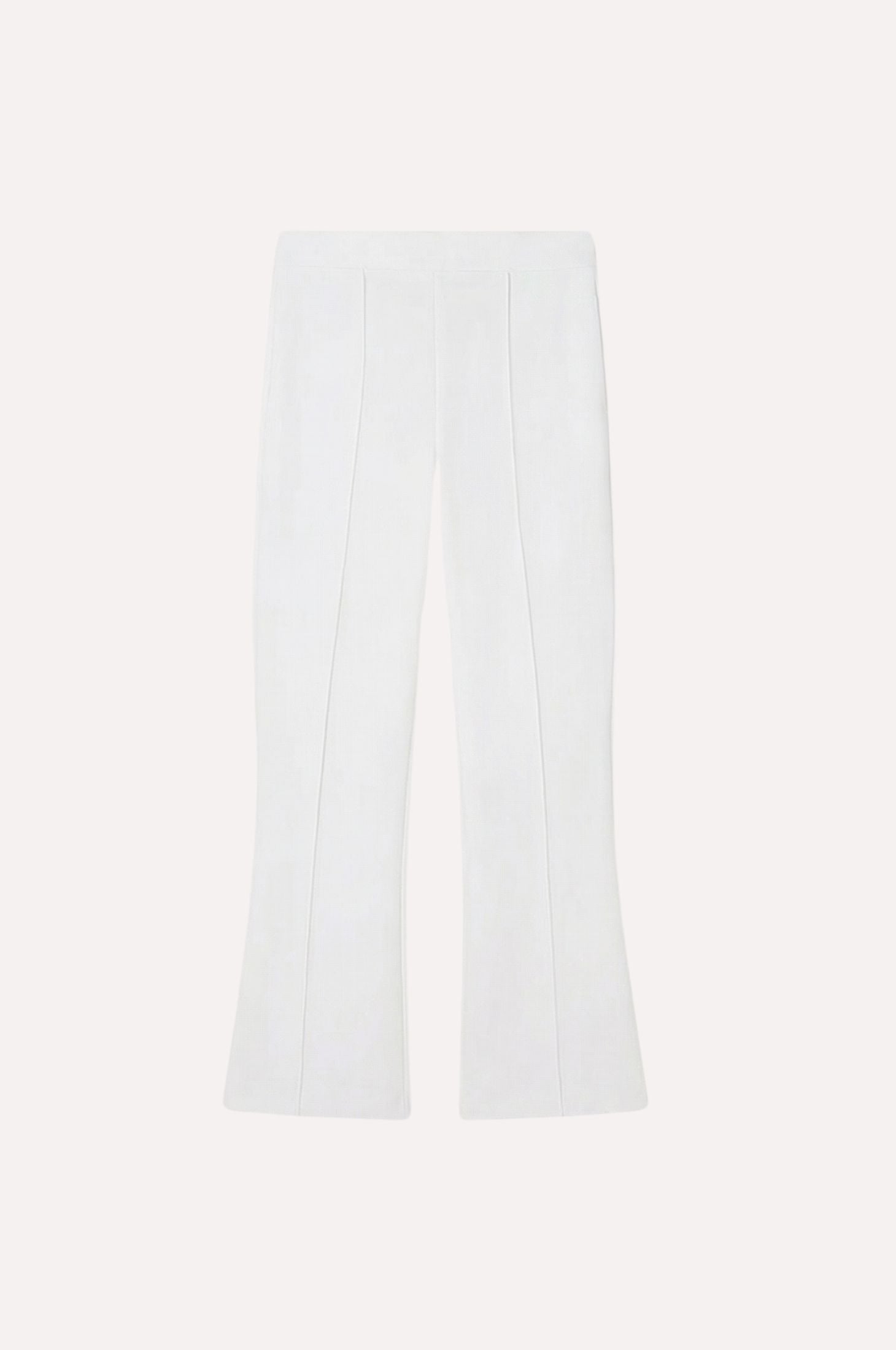Soft, stretch viscose delivers structure and weight for a smoothing, sculpted fit. Featuring a comfortable elastic waistband, center seams down each leg for a lengthening effect, and a subtle kick flare at the hem.