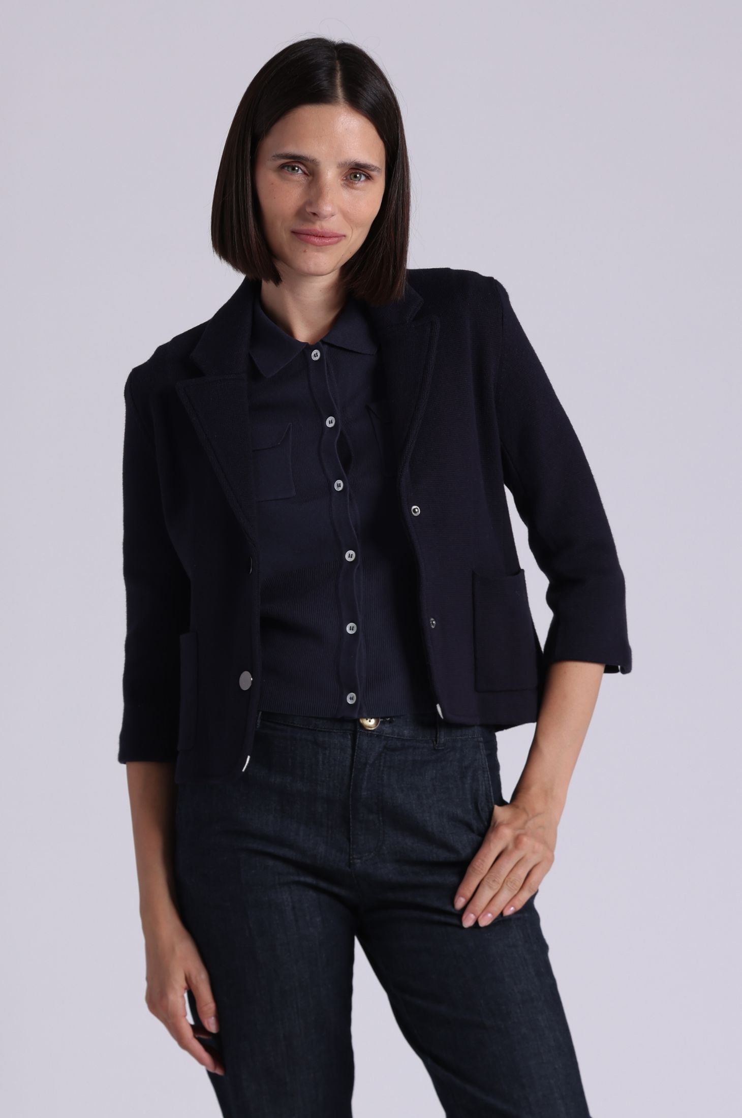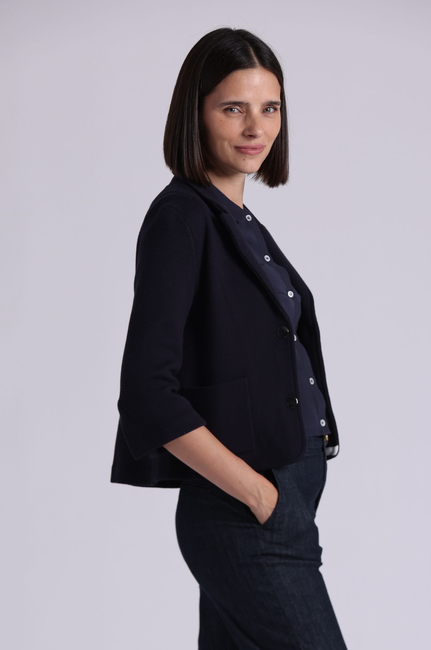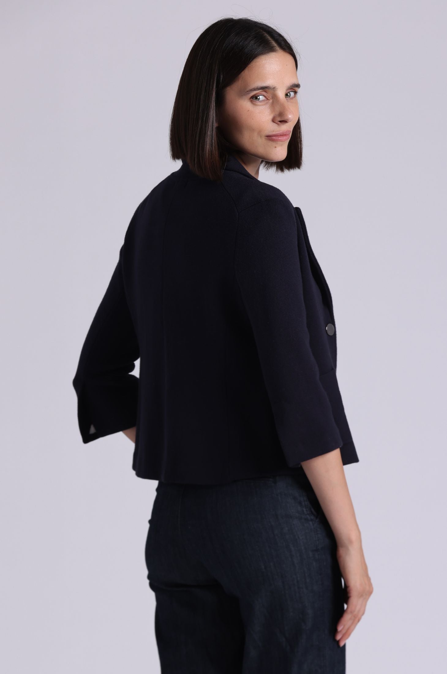 This shrunken blazer features a cropped, true-to-size fit with 3/4 sleeves for a clean, tailored silhouette. Crafted from a soft, lightweight viscose blend, it drapes effortlessly and pairs seamlessly with high-waisted trousers or dresses for a polished, city-ready look.