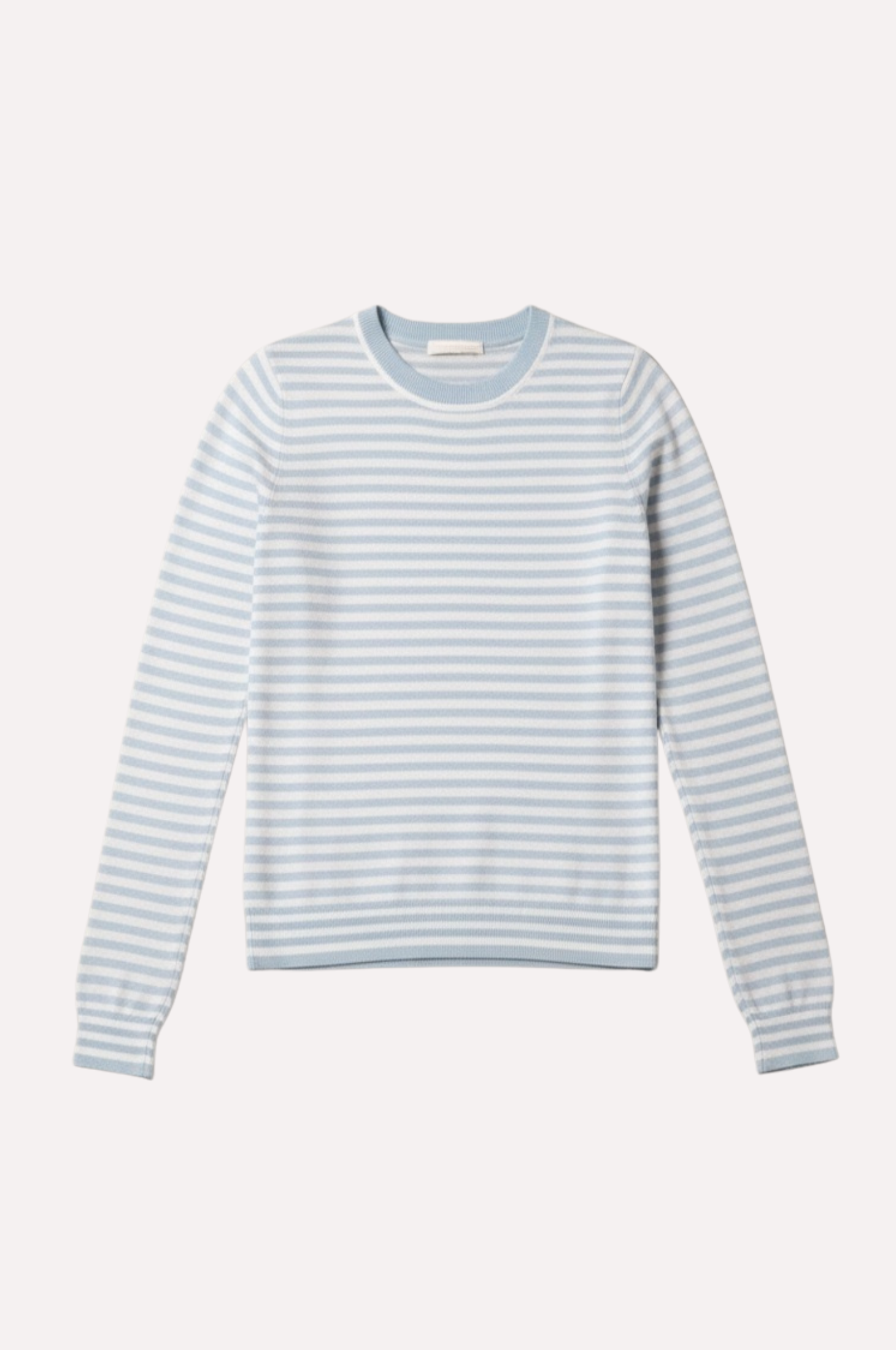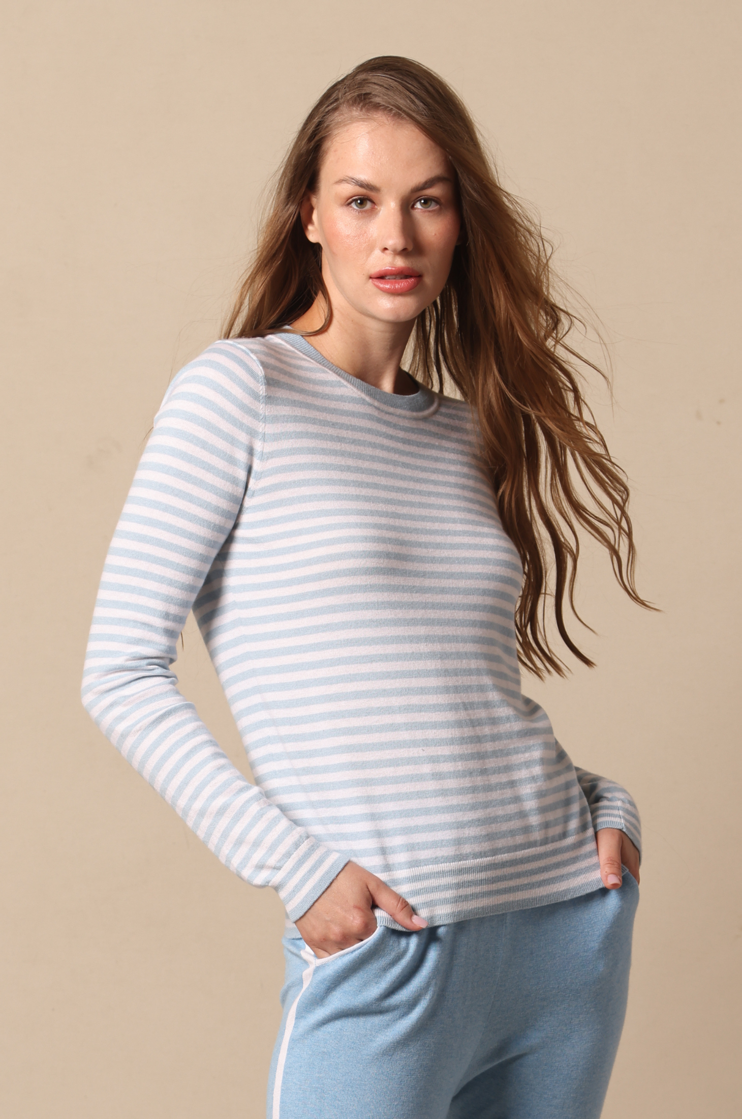 Soft, lightweight, and endlessly wearable, this striped crew blends luxe Supima cotton cashmere with a clean, flattering silhouette. The long sleeves and subtle stripes make it an easy go-to for polished weekend looks or casual office days.