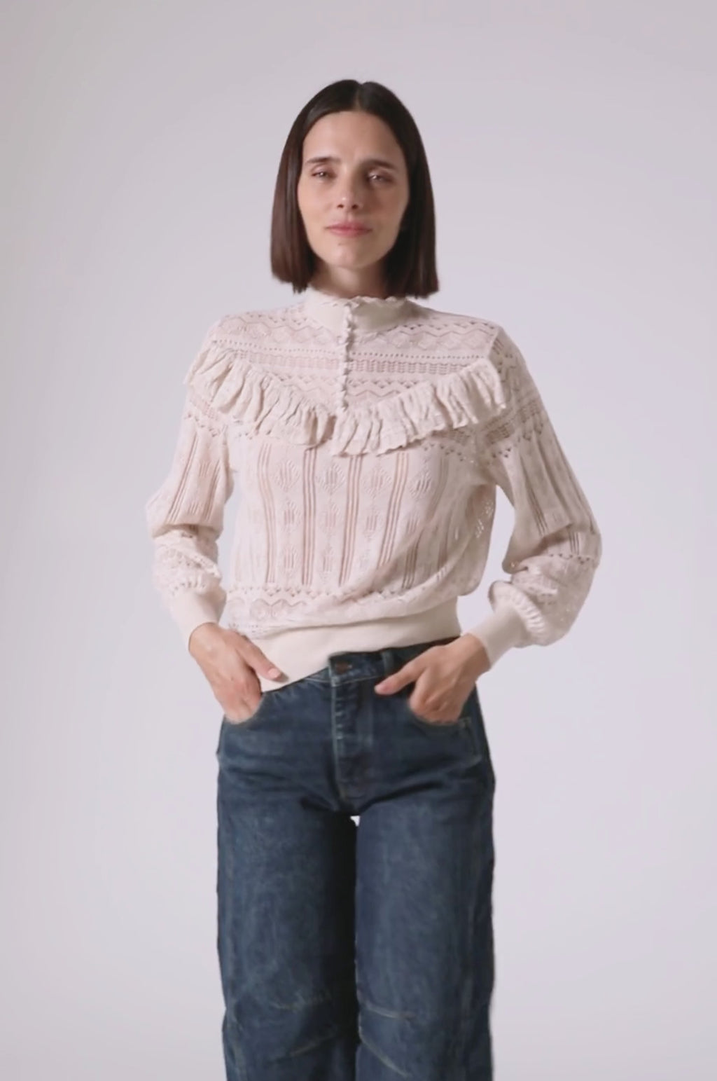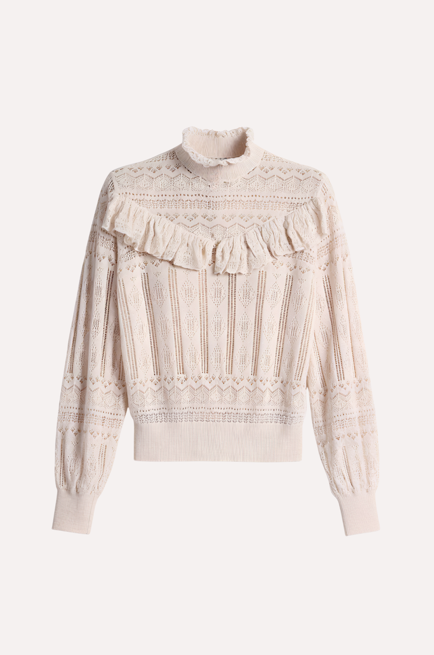 Cotton Blend Mock Neck With Ruffle Detail Lace Top
