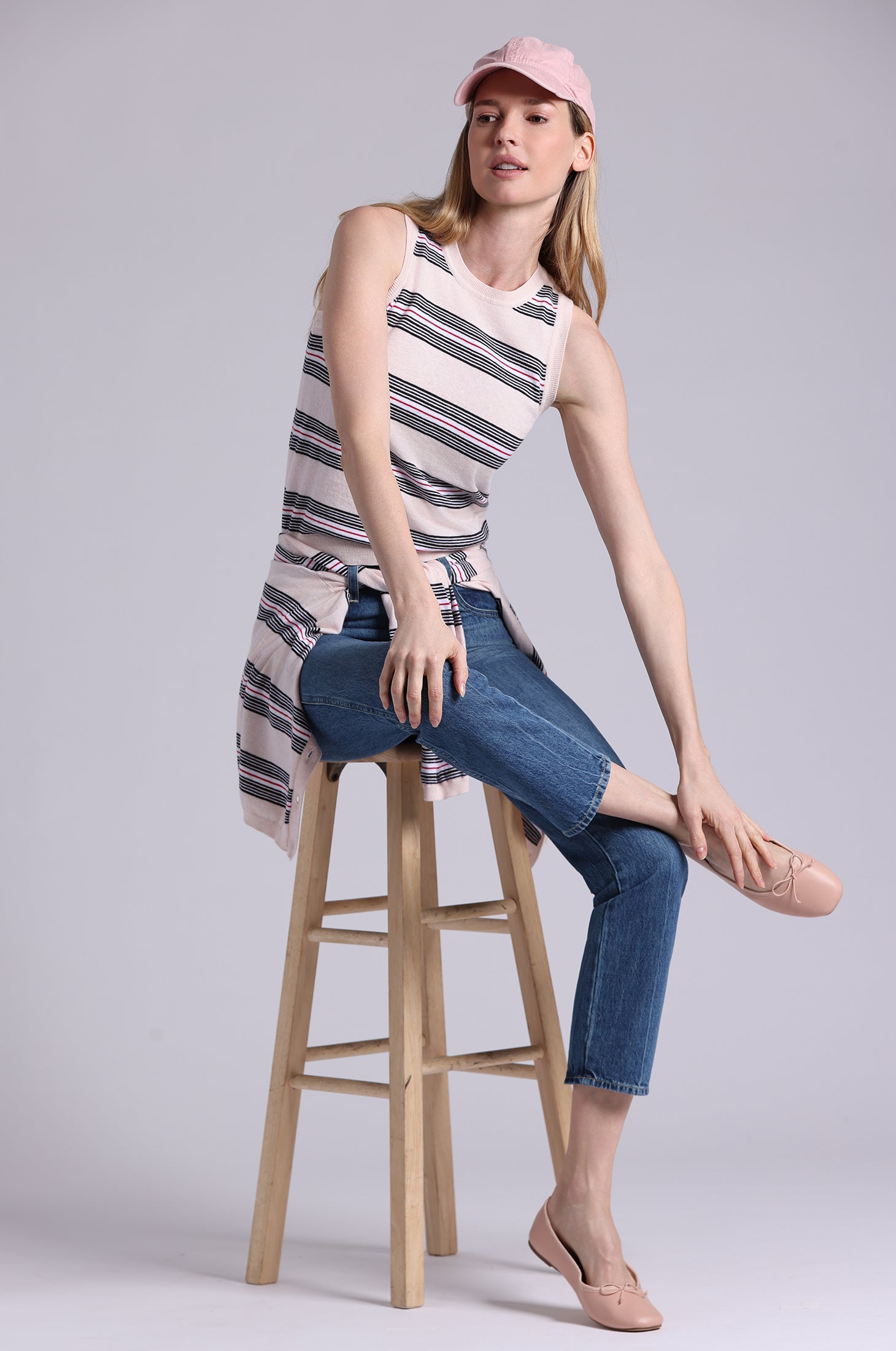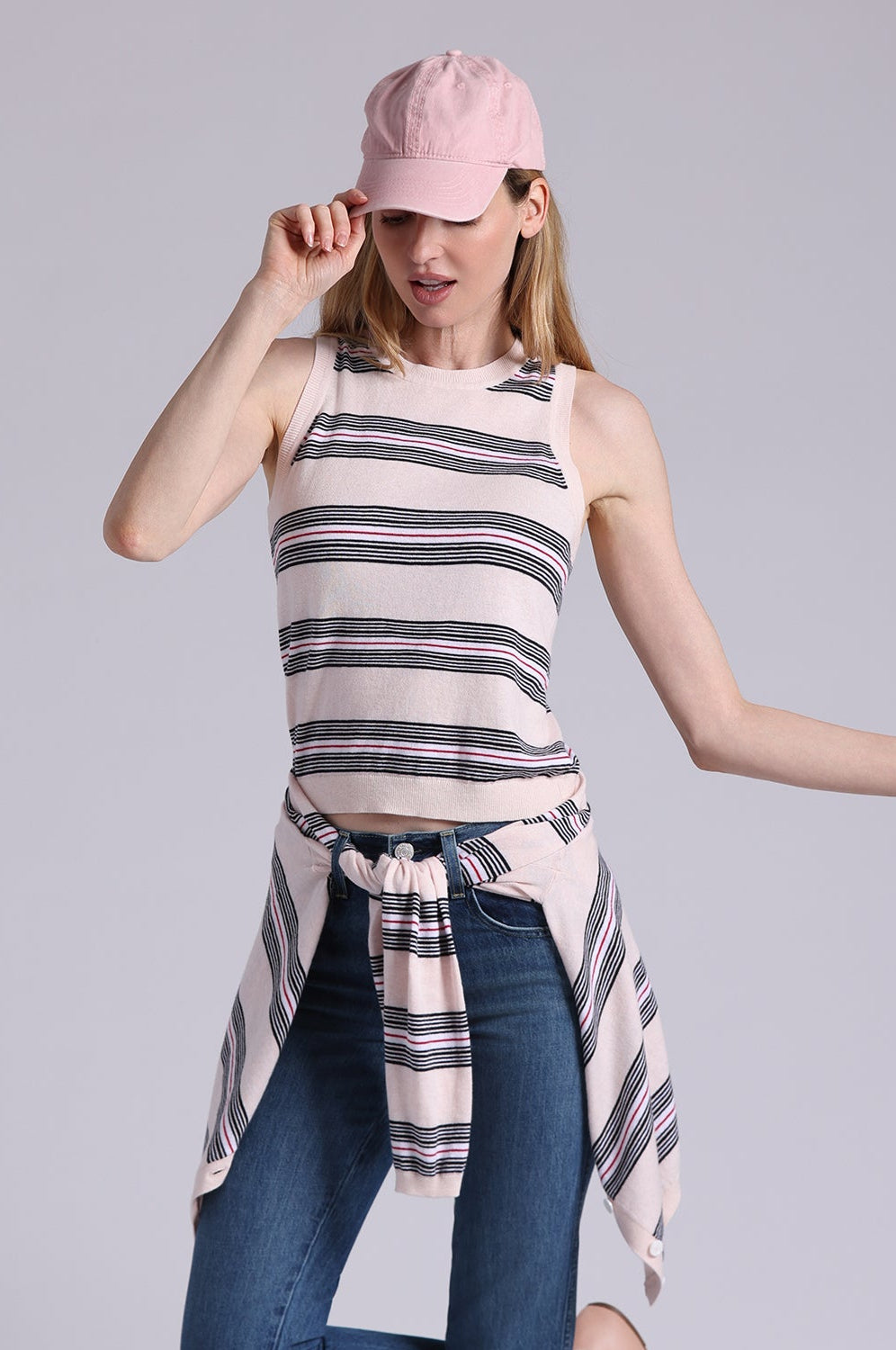 Lightweight cotton cashmere with delicate stripes and a clean and sporty racerback cut.