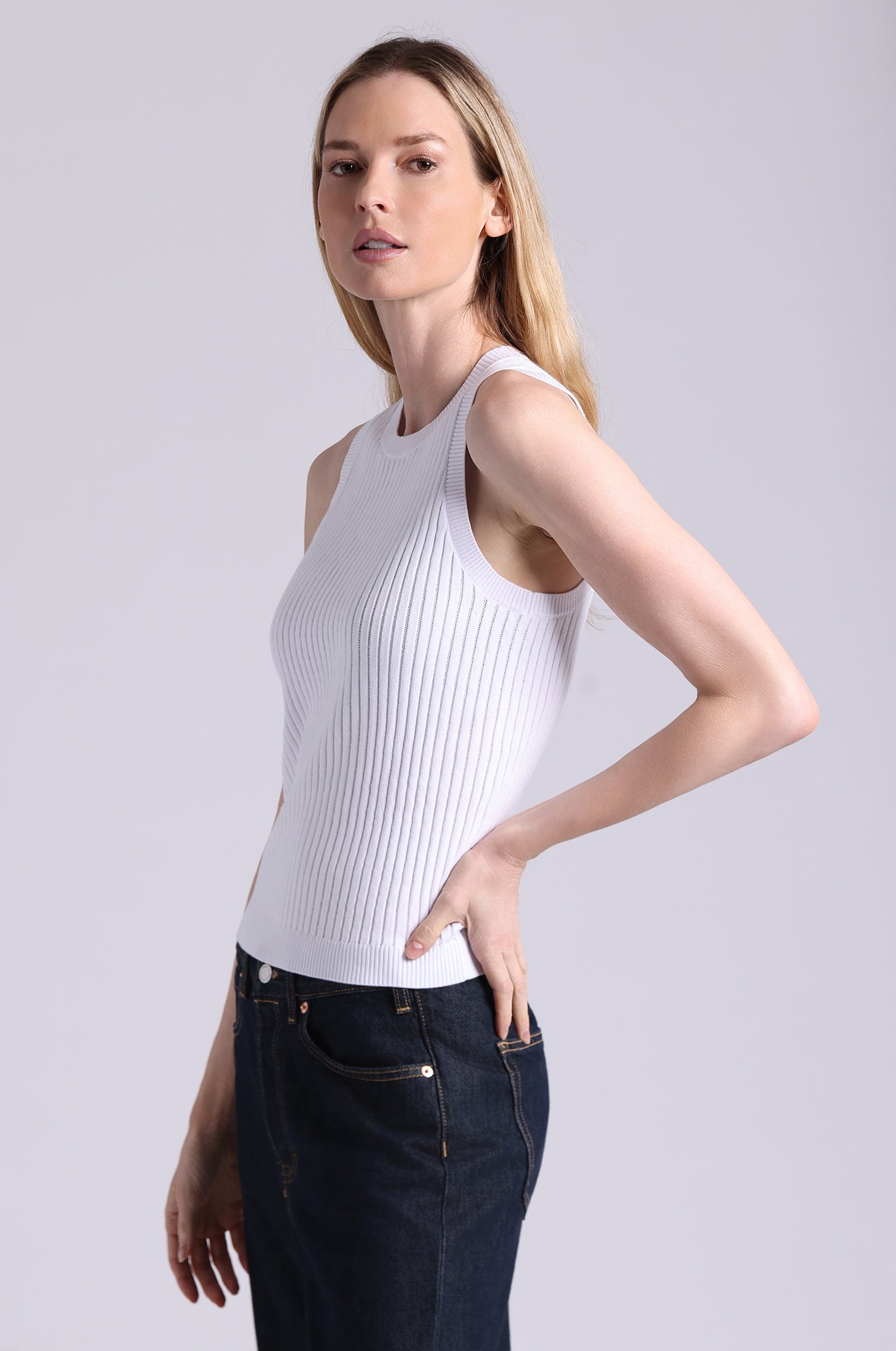 A refined essential with delicate pointelle detailing, this ribbed tank is crafted from silky-soft viscose with a lightweight, breathable feel and a flattering, body-skimming fit that layers effortlessly or stands beautifully on its own.