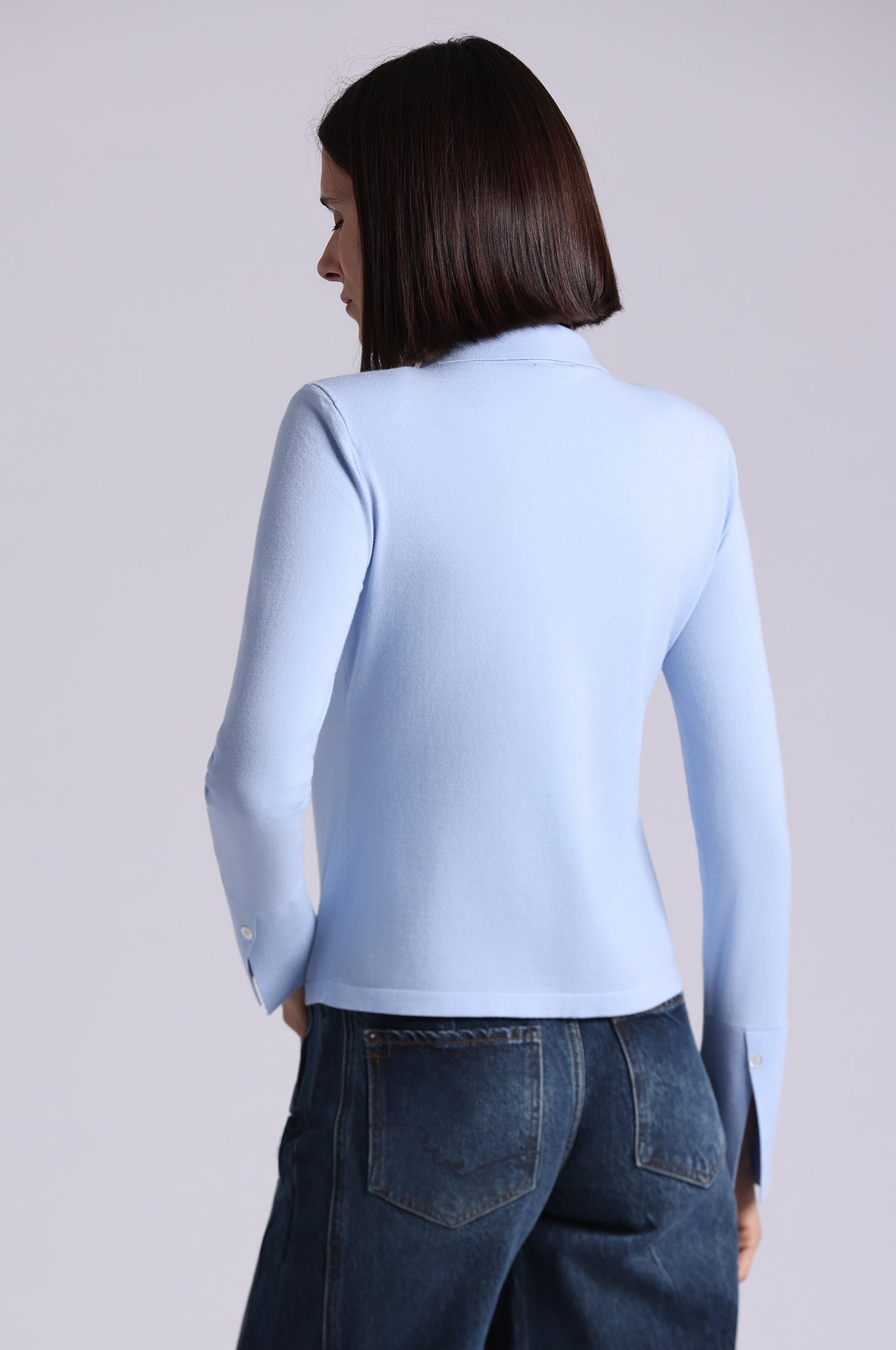 Silky viscose with a structured collar and subtle V neckline for subtle allure. Soft ruffle detailing cascades down the front, while flared cuffs with delicate slits add movement and edge.