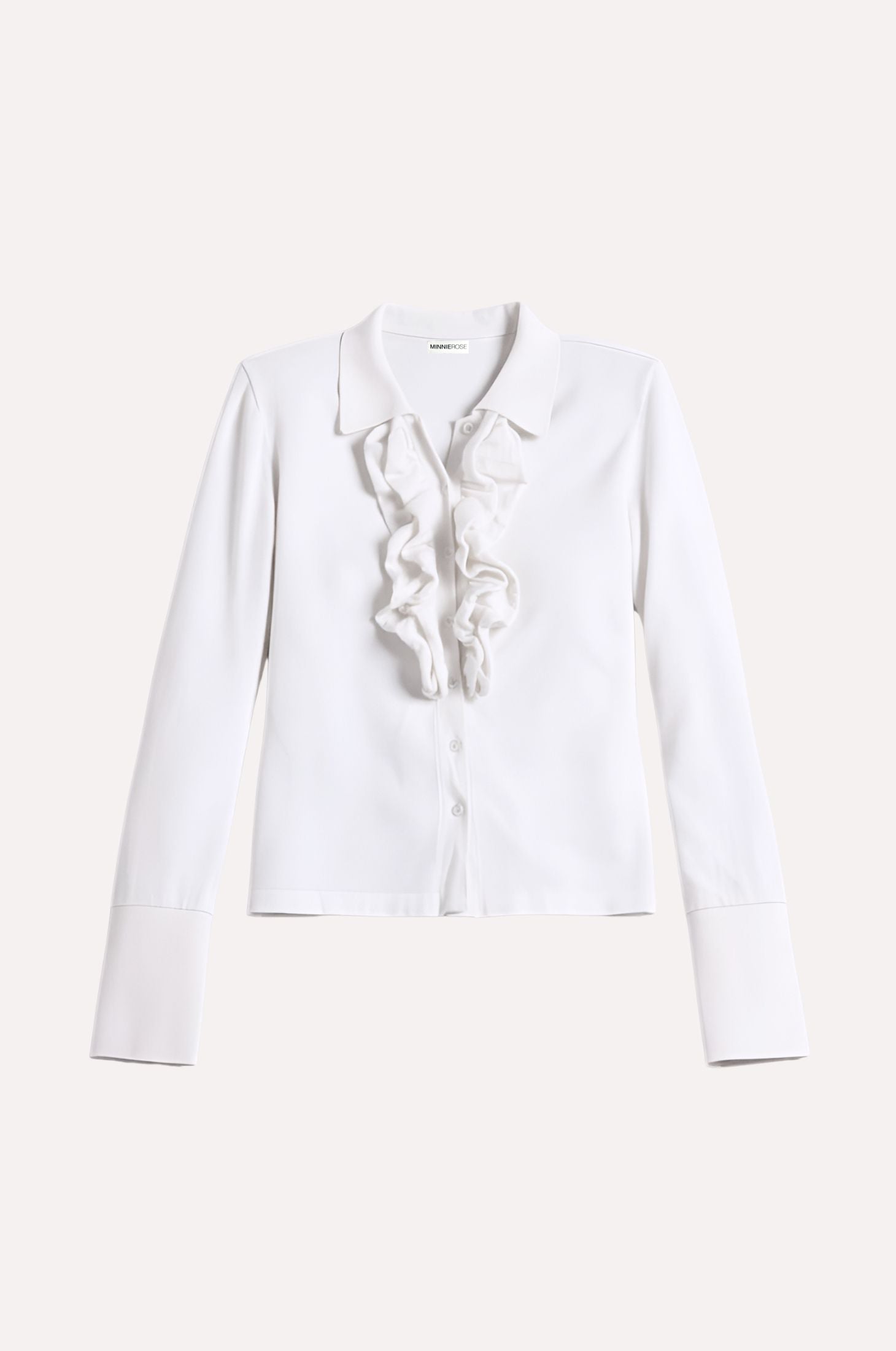 Silky viscose with a structured collar and subtle V neckline for subtle allure. Soft ruffle detailing cascades down the front, while flared cuffs with delicate slits add movement and edge.