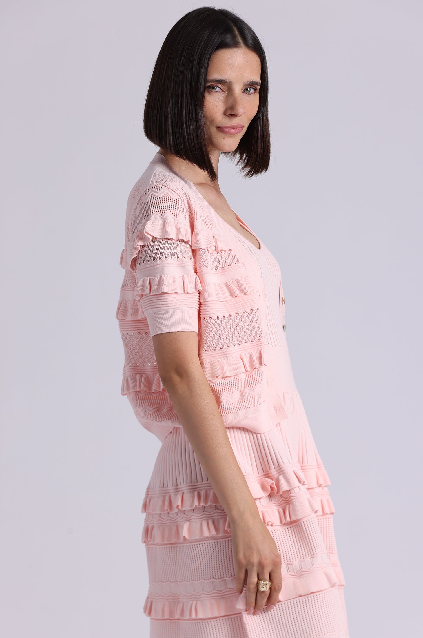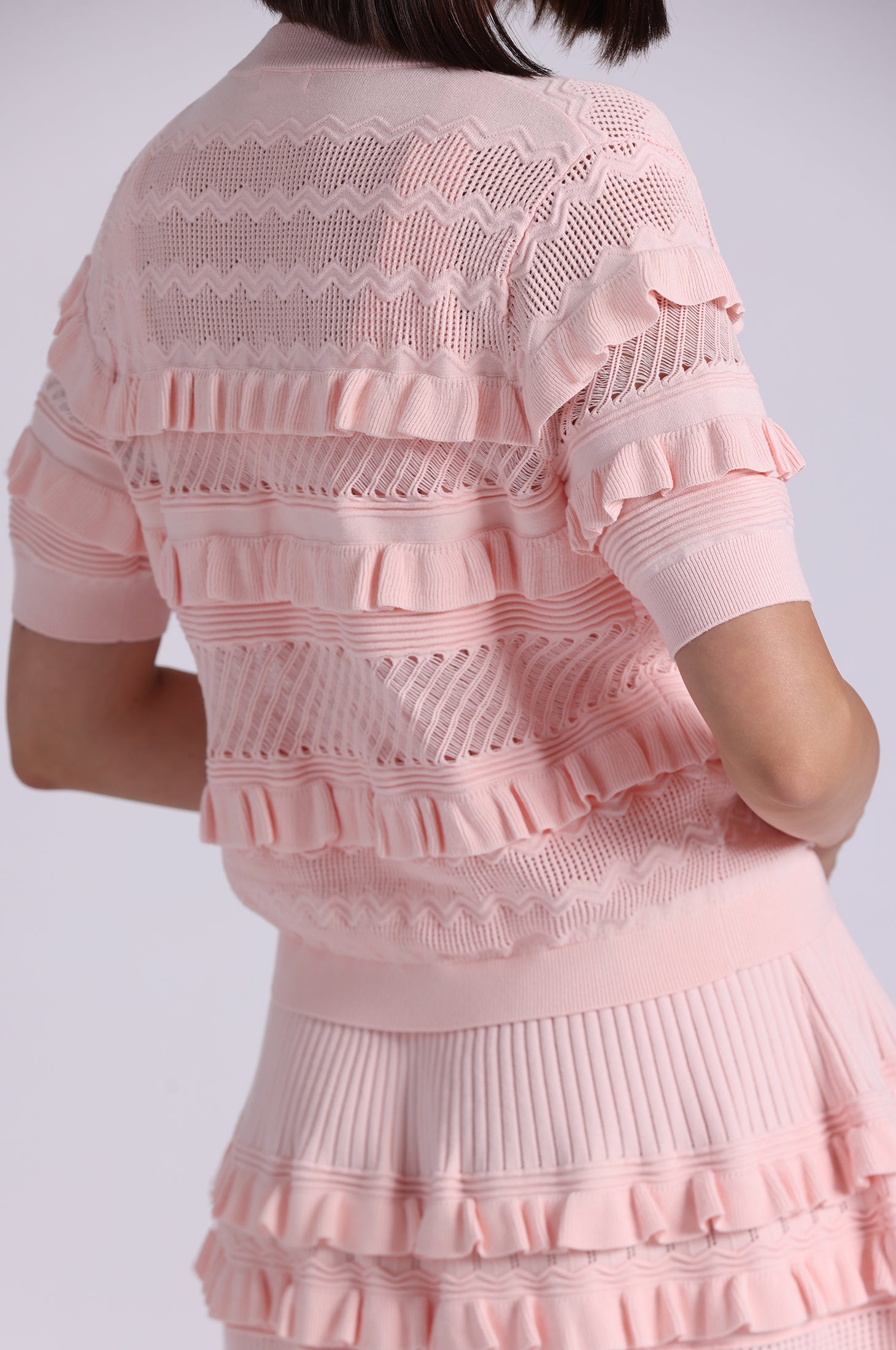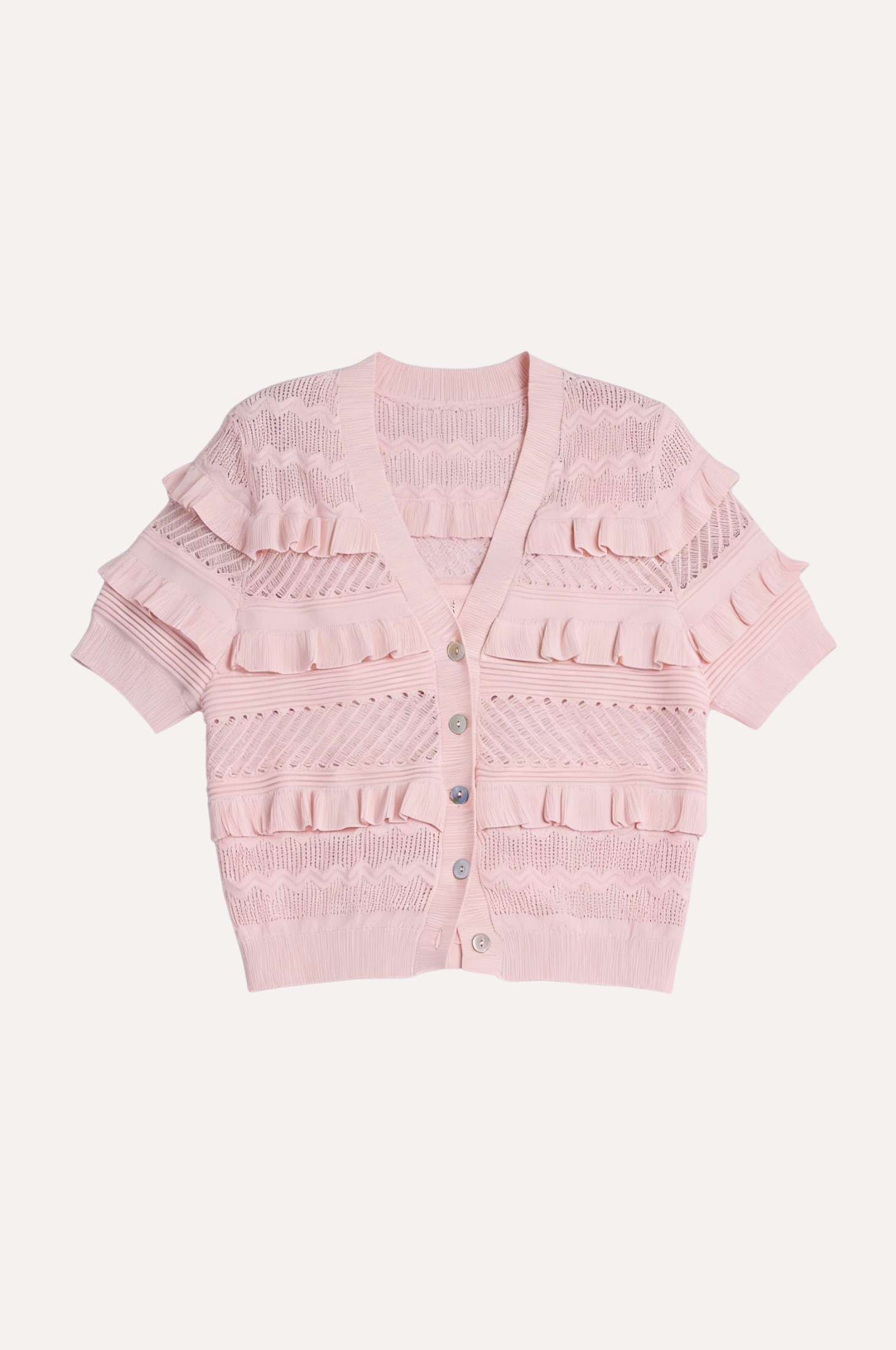 Airy pointelle viscose shaped into a short sleeve silhouette with gentle puff through the body and sleeves. Finished with a 360° ruffle button-down front and fitted sleeve and hem trims for definition.