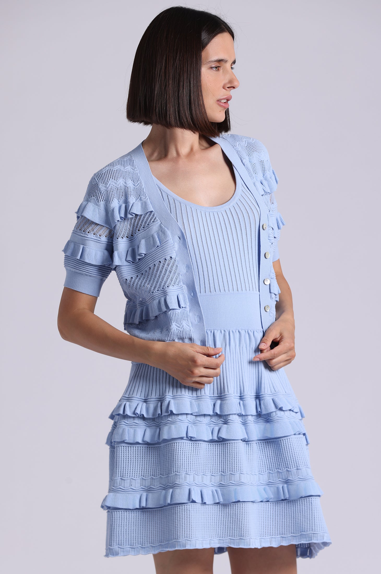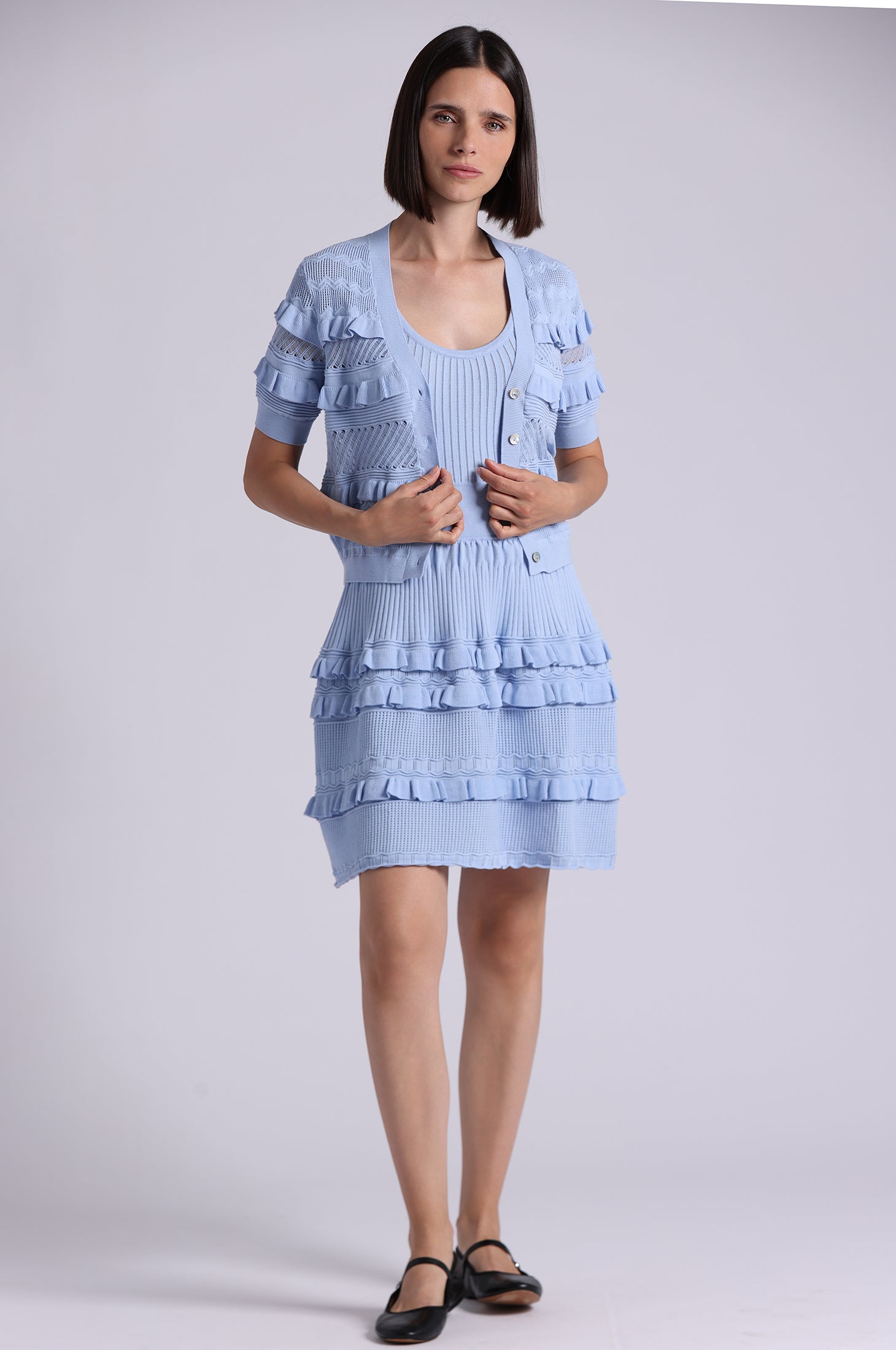 Airy pointelle viscose shaped into a short sleeve silhouette with gentle puff through the body and sleeves. Finished with a 360° ruffle button-down front and fitted sleeve and hem trims for definition.