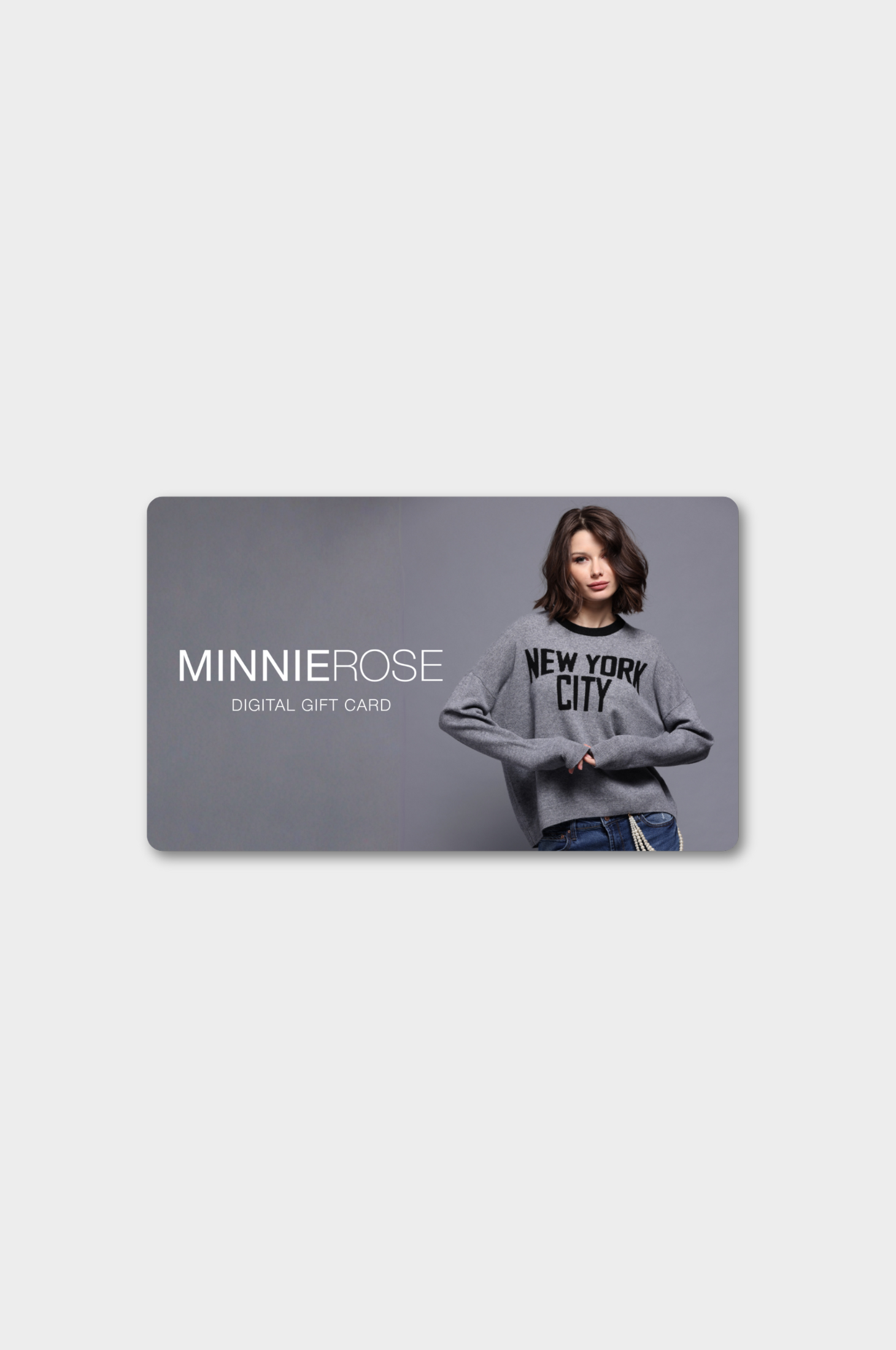 Gift Card Policy: Minnie Rose digital gift cards are non-returnable and non-refundable. They never expire and may be redeemed online toward any purchase. Treat your card like cash—unfortunately, lost or stolen cards can’t be replaced.Note: Gift cards are delivered by email and contain instructions to redeem them at checkout. Our gift cards have no additional processing fees.