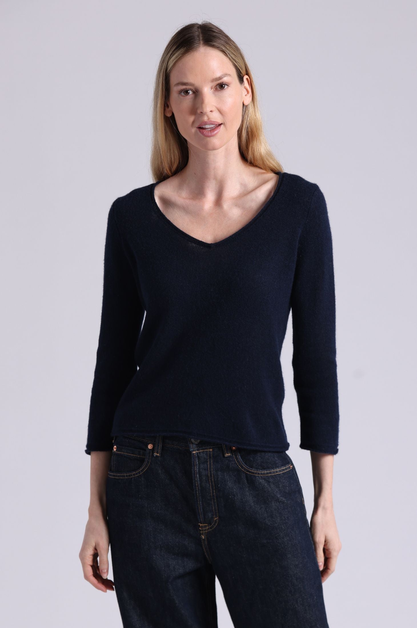 A relaxed wardrobe essential, this V-neck sweater features softly rolled edges at the neckline and 3/4 sleeves for a lived-in finish. Crafted from ultra-soft featherlight cashmere, it offers soft and cozy luxury in one delicate piece.