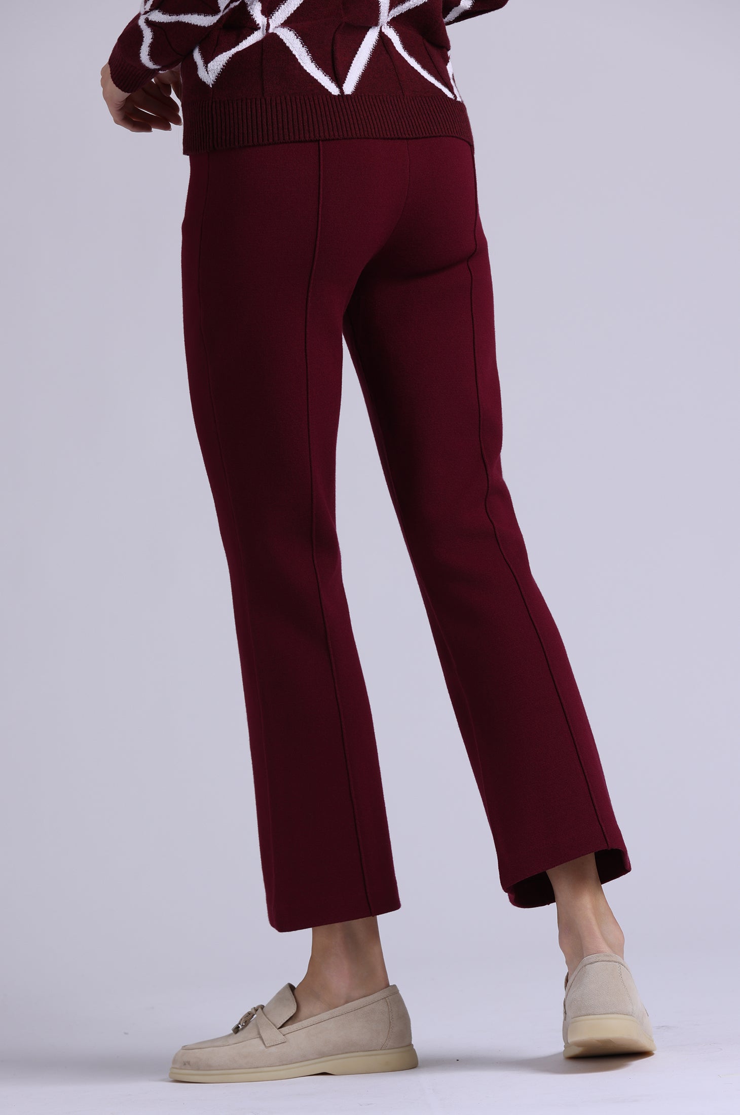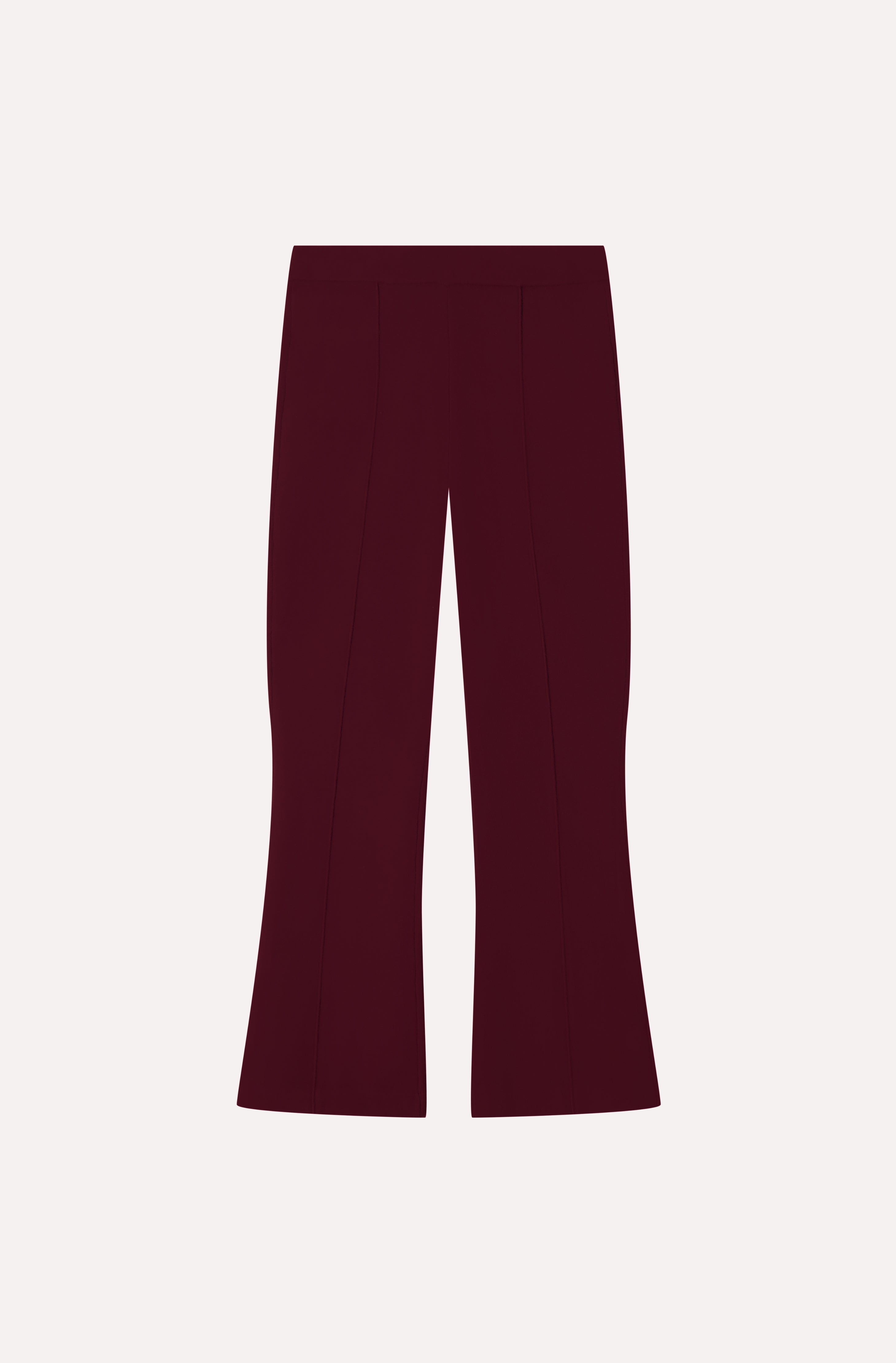 Soft, stretch viscose delivers structure and weight for a smoothing, sculpted fit. Featuring a comfortable elastic waistband, center seams down each leg for a lengthening effect, and a subtle kick flare at the hem.